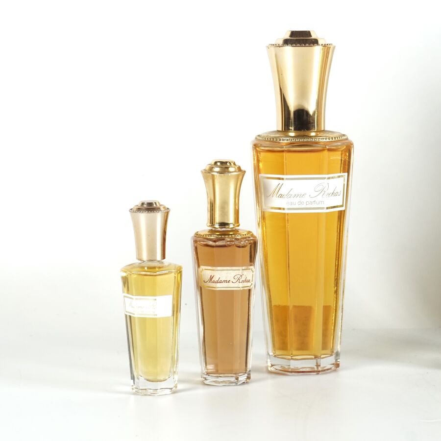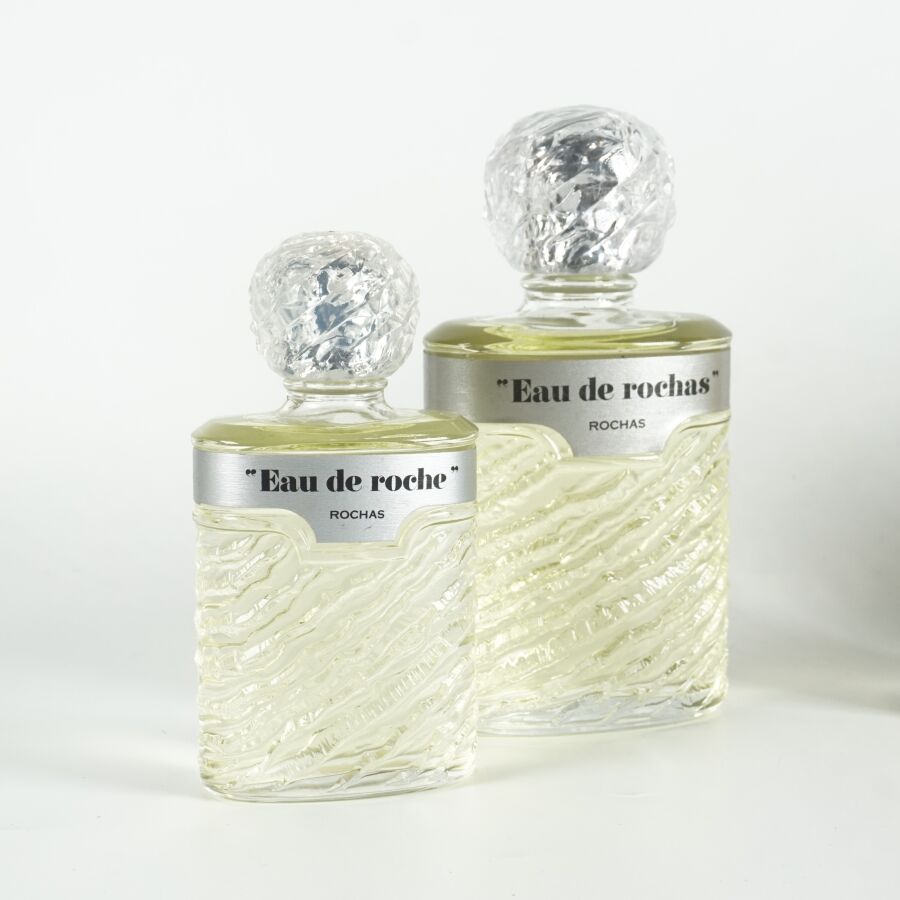 ROCHAS : Ensemble de sept flacons factices comprenant "Eau de Rochas", deux flacons et un pot de cristaux en verre à décor en forme de vagues, H. 18 cm. H. 16 cm. H. 13 cm ; "Madame Rochas", trois flacons en verre à pans coupés, bouchons en métal doré à décor de frises perlées, H. 16.5 cm. H. 10.5 cm. H. 6.5 cm et "Moustache", flacon en verre rainuré, bouchon en métal doré, H. 13.8 cm (liquide factice).