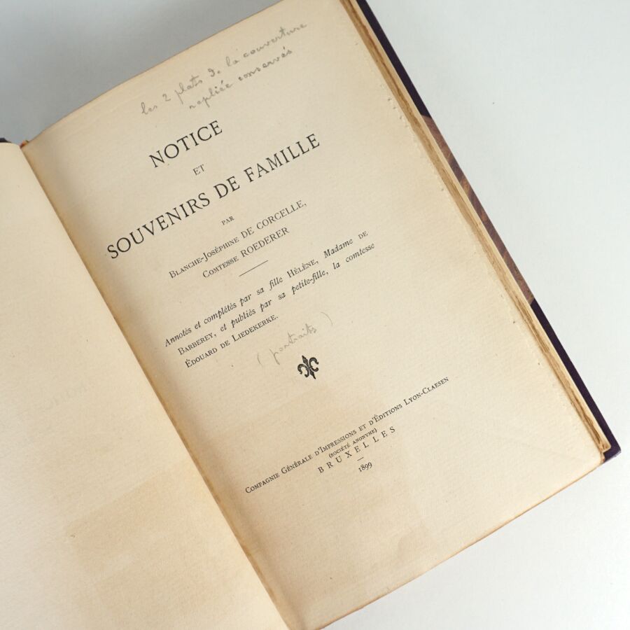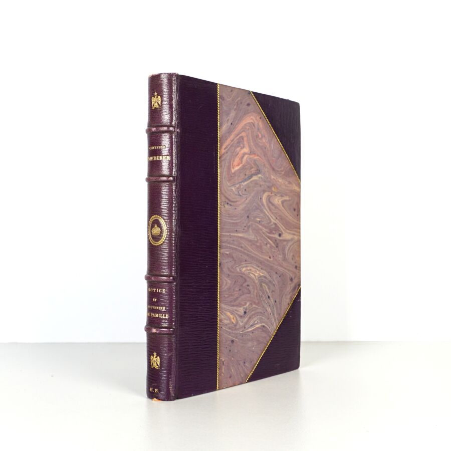 ROEDERER (Blanche Joséphine de Corcelle, Comtesse). Notice et souvenirs de famille. Annotés et complétés par sa fille Hélène, Madame de Barberey, et publiés par sa petite-fille, la comtesse Édouard de Liedekerke. Bruxelles & Paris, Compagnie générale d'impressions et d'éditions Lyon-Claesen, 1899. In-8 demi-maroquin long grain brun à coins, dos à nerfs orné, titre doré, initiales H.S. en queue, filet doré sur les plats, couv. rempliée conservée.