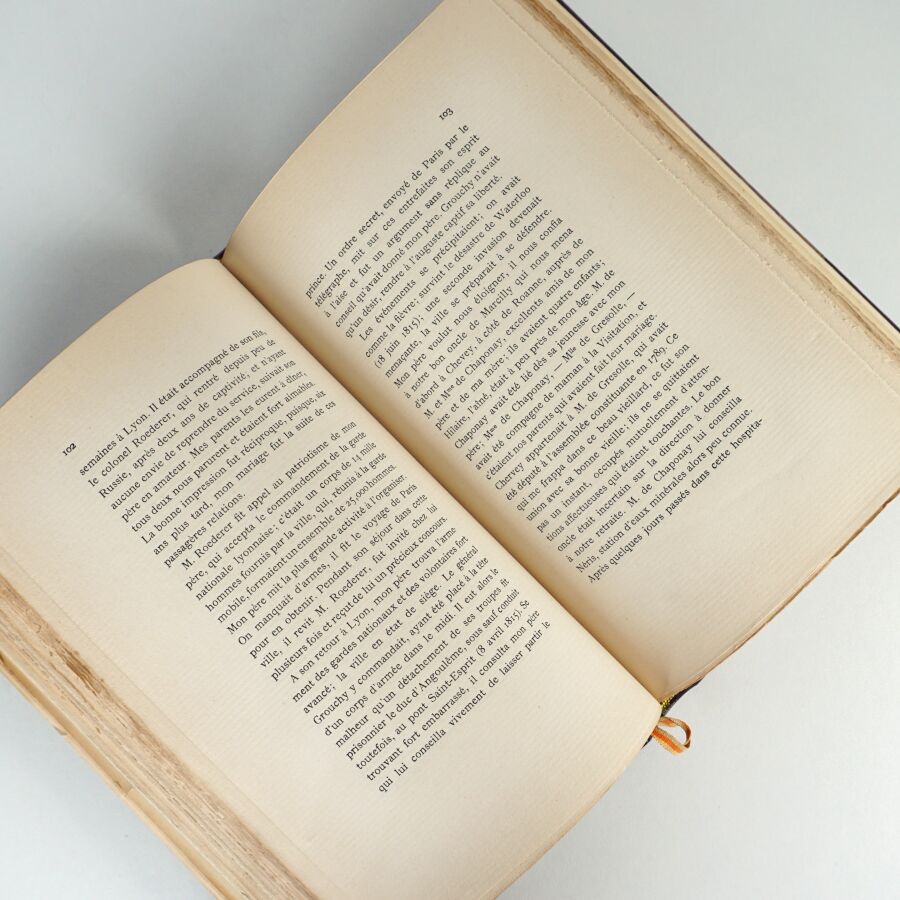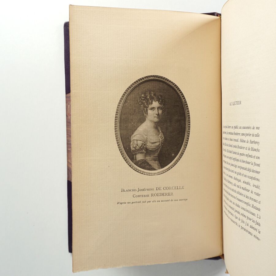 Très rare ouvrage, non mis dans le commerce, tiré sur vergé à quelques exemplaires réservés à la famille de l'autrice et ses proches. Orné de 2 portraits de Balnche de Corcelle, épouse du colonel Roederer, fils du Comte (ami de Bonaparte).