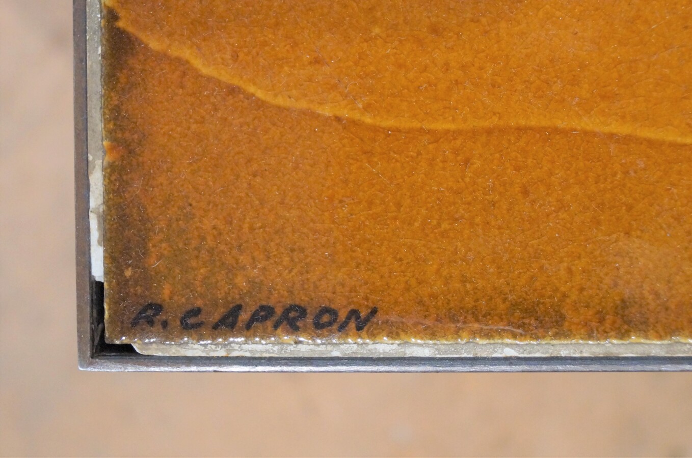 Roger CAPRON (1922-2006) : Table basse rectangulaire, monture et piètement en métal, le plateau formé de 9 carreaux de céramique émaillée en camaïeu d'ocre, l'un à décor d'un oiseau stylisé, signée, 91 x 47 x H. 30 cm.