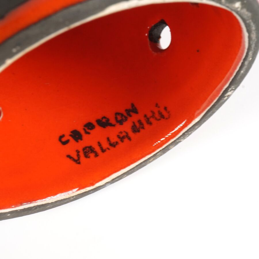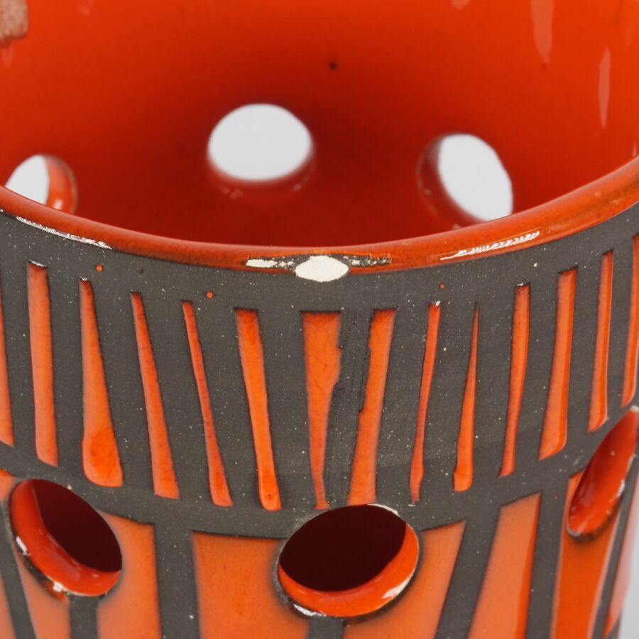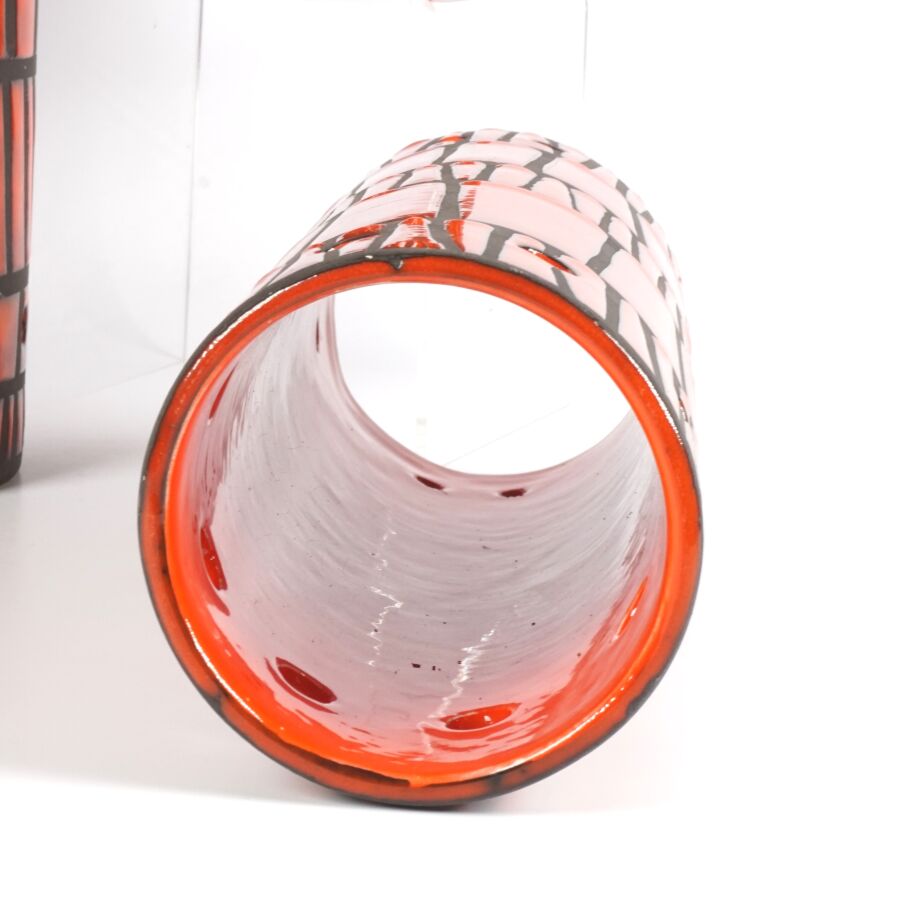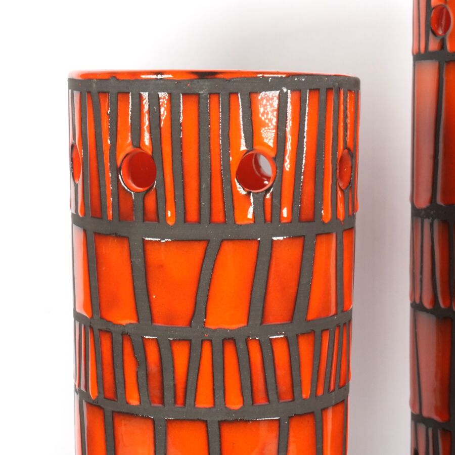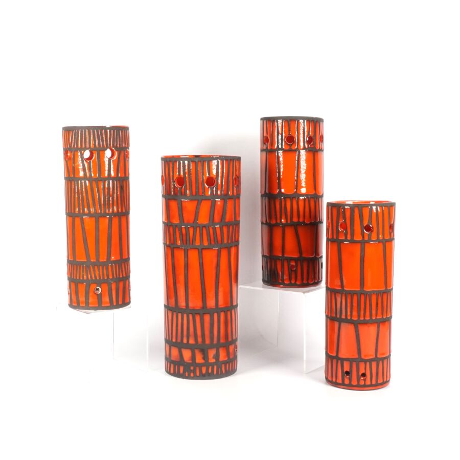 Roger CAPRON (1922-2006) - VALLAURIS : Ensemble de quatre céramiques émaillées polychromes de forme rouleau à décor de liserés bruns de forme géométrique sur fond orangé, signées " Capron Vallauris ", H. De 26 à 32 cm (petit éclat au col de l'un).