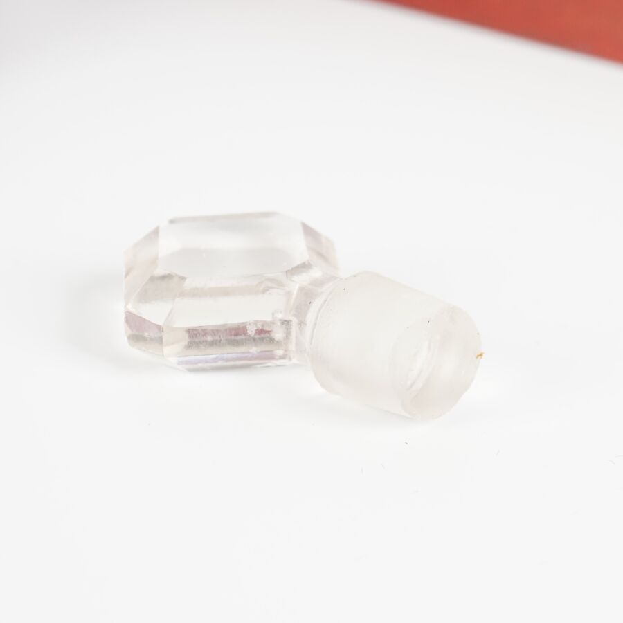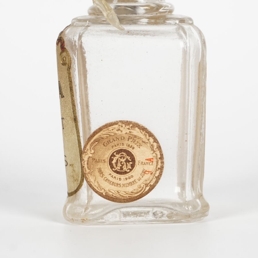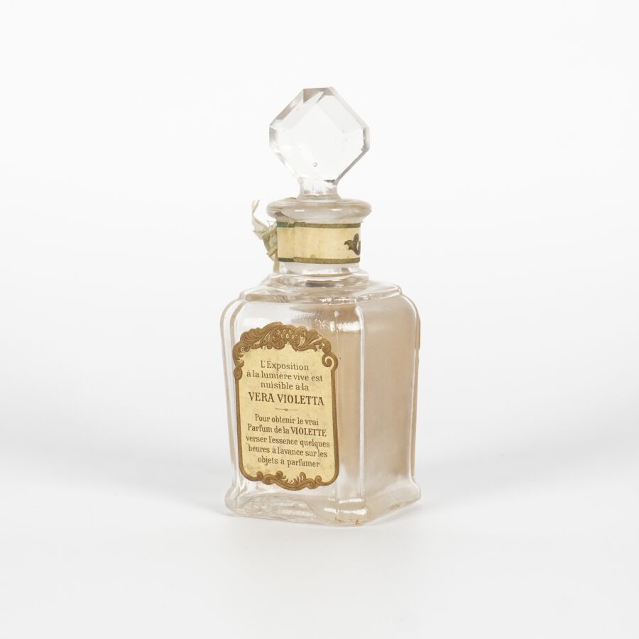 ROGER & GALLET PARIS : "Vera-Violetta", flacon de section carrée en verre incolore, avec son bouchon losangé facetté, porte une étiquette sur une face gaufrée Art Nouveau marquée "Essence vera-violetta, Roger & Gallet, Paris", seconde étiquette sur un côté "Grand Prix Paris 1889 - 1900 hors concours", présenté dans son emboîtage d'origine en carton rouge, H. Flacon : 10 cm (égrenures à l'intérieur du bouchon, usures à la boîte, vide).
