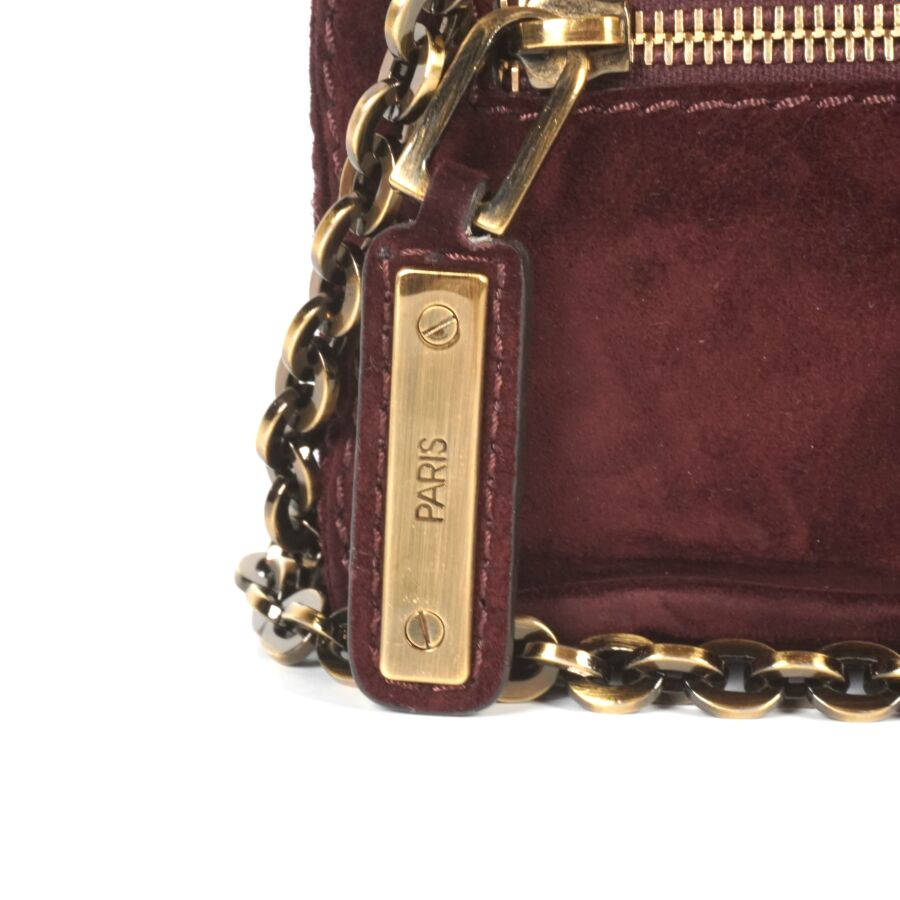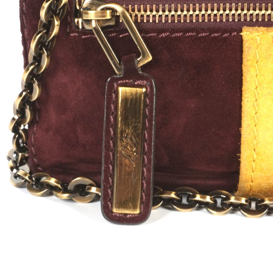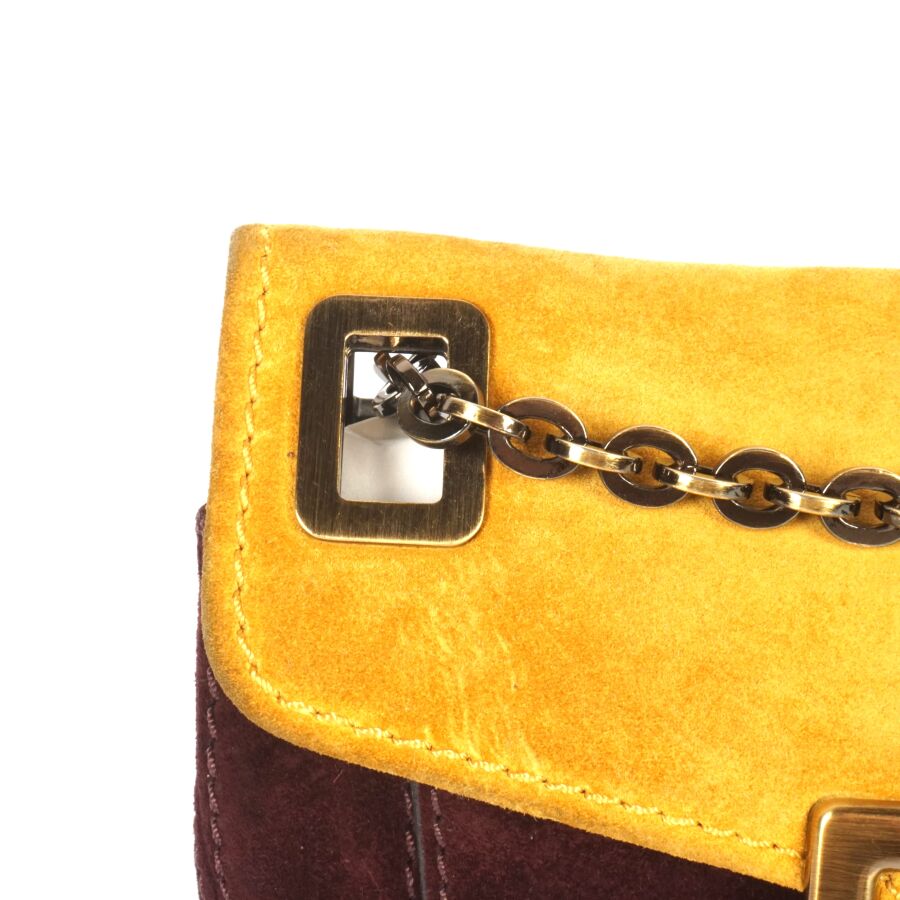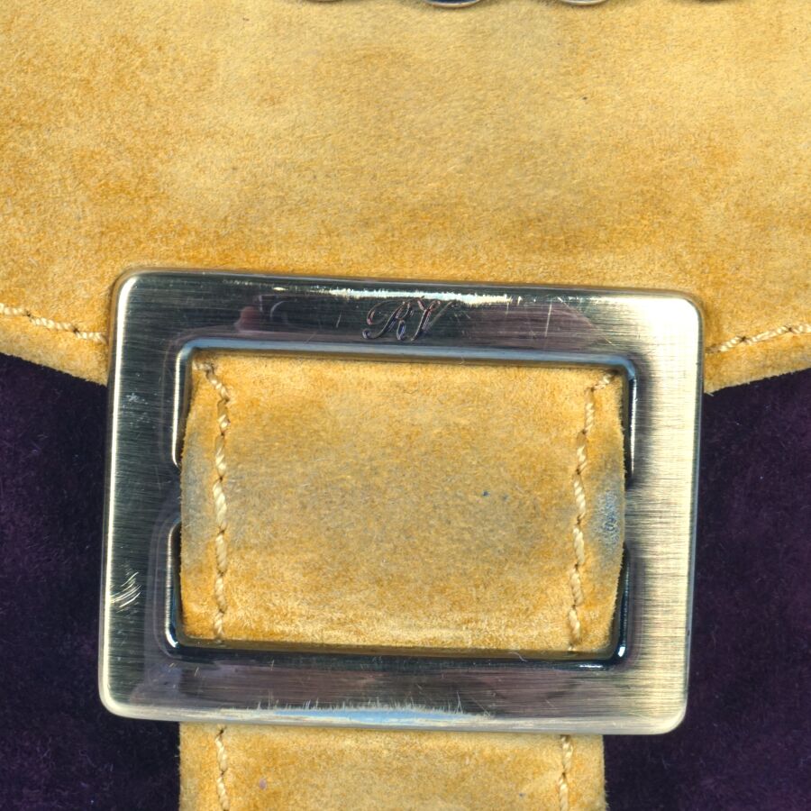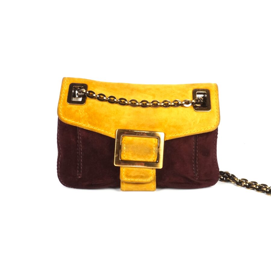 ROGER VIVIER : Sac "Mini" en daim tricolore (jaune, bordeaux/lie de vin et turquoise), bijouterie en métal doré, fermeture à rabat et système de fermeture en métal, intérieur doré, à deux compartiments avec pochette interne zippée, pochette externe à fermeture zippée logotée, bandoulière "chaîne" pour un porté épaule, présenté avec son dustbag d'origine, Dim. 12.7 x 20.2 x 5 cm environ (quelques traces).