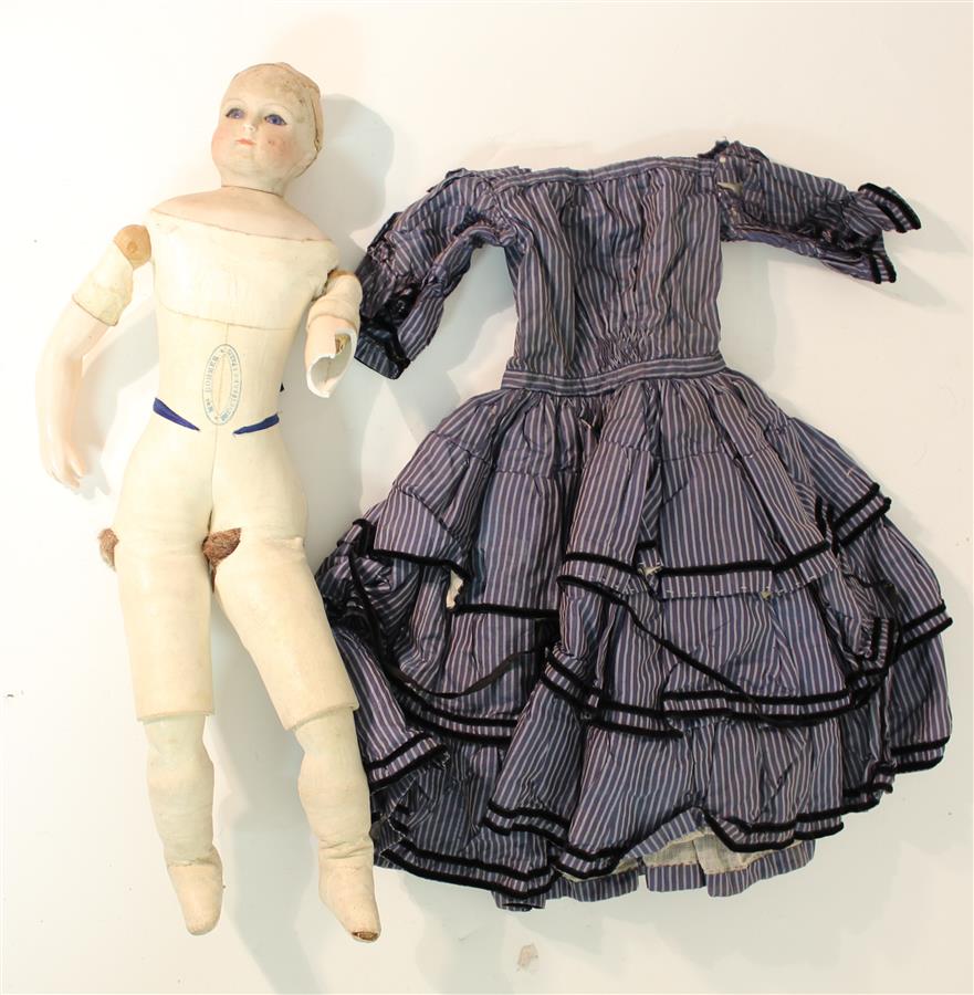 ROHMER Paris : Poupée mannequin, tête en biscuit, bras en porcelaine, marque au tampon sur le buste en cuir, H. 45 cm (un bras cassé et manquant, manque la perruque, un petit fêle à la tête) - On y joint 4 robes, jupes, veste, corset et divers sous-vêtements