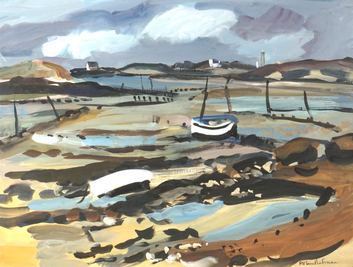 Roland LEFRANC (1931-2000), "Barques en Bretagne", gouache sur papier signée en bas à droite, 48 x 64 cm (à vue).
