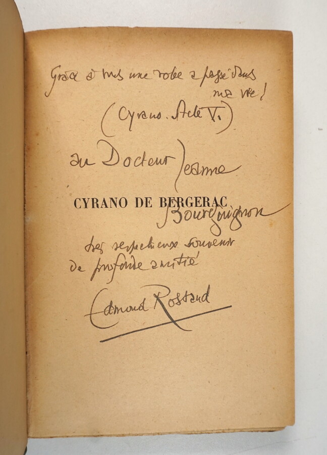 ROSTAND (Edmond) - Ensemble de 4 volumes : Cyrano de Bergerac - Paris ; Librairie Charpentier et Fasquelle, Eugène Fasquelle, 1916 - 1 volume In-8° - Faux titre en partie détaché - Reliure de l'époque demi-basane verte (coins et coupes légèrement frottés) - Dos à nerfs orné (passé uniformément et frotté) - Pièce de titre maroquin bordeaux - Tête dorée - Envoi autographe signé de l'auteur au faux titre - Les Musardises - Paris ; Librairie Charpentier et Fasquelle, Eugène Fasquelle, 1911 - 1 volume In-8° - De petites rousseurs éparses - Marge supérieure du faux titre découpée - Reliure de l'époque demi-cuir de Russie noir à coins (1ère charnière fendue et dos quasi décollé) - Dos lisse orné et titré or (petits frottements) - Tête dorée - Envoi autographe signé de l'auteur à la 2nde garde blanche - L'Aiglon - Paris ; Librairie Charpentier et Fasquelle, Eugène Fasquelle, 1917 - 1 volume In-8° - Reliure de l'époque demi-basane noire à coins à la Bradel (petite épidermure à 1 coin du 2nd plat) Couvertures vert d'eau conservées (légèrement salies) - Dos lisse orné et titré or (des griffures et frottements) - Tête dorée - Envoi autographe signé de l'auteur à la 2nde garde blanche (détachée) - Chanteclerc - Paris ; Librairie Charpentier et Fasquelle, Eugène Fasquelle, 1910 - 1 volume In-8° - Reliure de l'époque demi-basane noire à coins à la Bradel - Couvertures vert d'eau conservées (légèrement salies) - Dos lisse orné et titré or (des griffures et frottements) - Tête dorée - Bon ensemble.