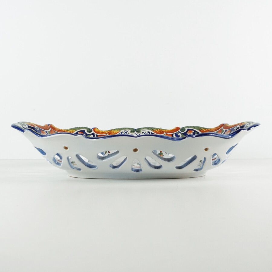 ROUEN : Bannette ajourée en faïence émaillée polychrome à décor de fleurs, l'aile ornée de rinceaux, marqué dessous, 20ème siècle, L.34 cm.