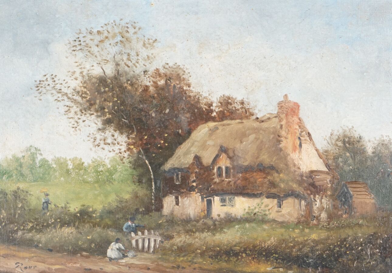 ROUX (XXe), "Personnages devant la chaumière", huile sur panneau signée en bas à gauche, 19 x 27 cm.