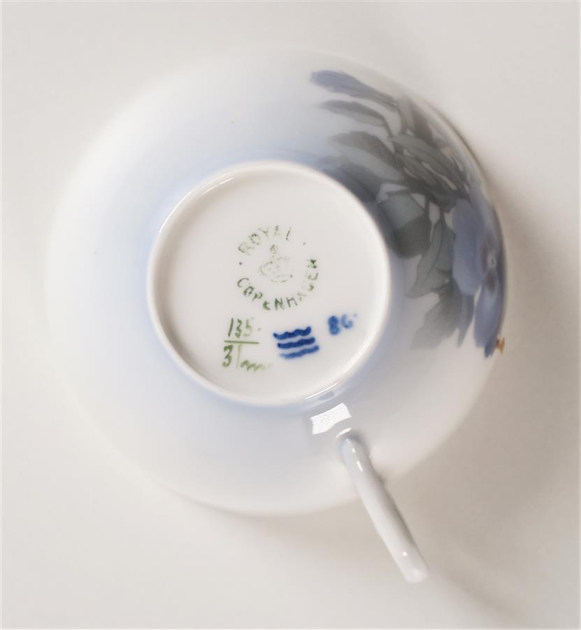 ROYAL COPENHAGUE : Service à dessert en porcelaine à décor émaillé polychrome d'animaux, poissons et de végétaux, comprenant 12 assiettes à dessert, 12 tasses et leurs tasses, différents décor. On joint un plat à homard et un plat à poisson d'un modèle similaire, D. assiettes : 20 cm. D. sous-tasses : 14 cm. L. Plat homard : 27 cm. L. plat poisson : 26.5 cm (petits éclats et petites traces).