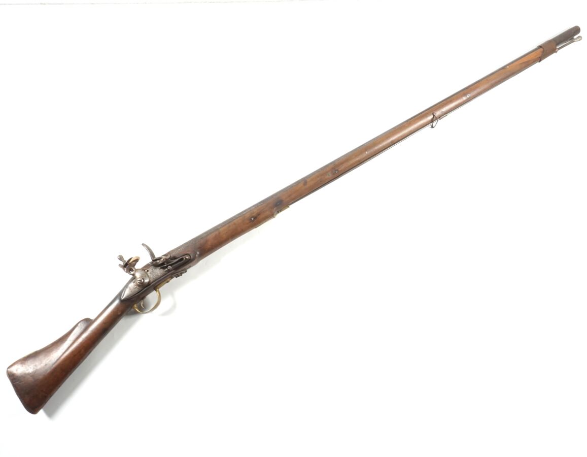ROYAUME DE GRANDE-BRETAGNE - FUSIL A SILEX TOWER, platine à silex et chien à corps rond, platine rappée " TOWER " et " GR " sous couronne, canon rond piqué de 120 cm, garnitures en laiton, baguette en fer, monture à crosse à joue en noyer (fût accidenté à l'avant), mécanisme semblant fonctionnel, longueur : 160 cm, début XIXème, ABE/BE.