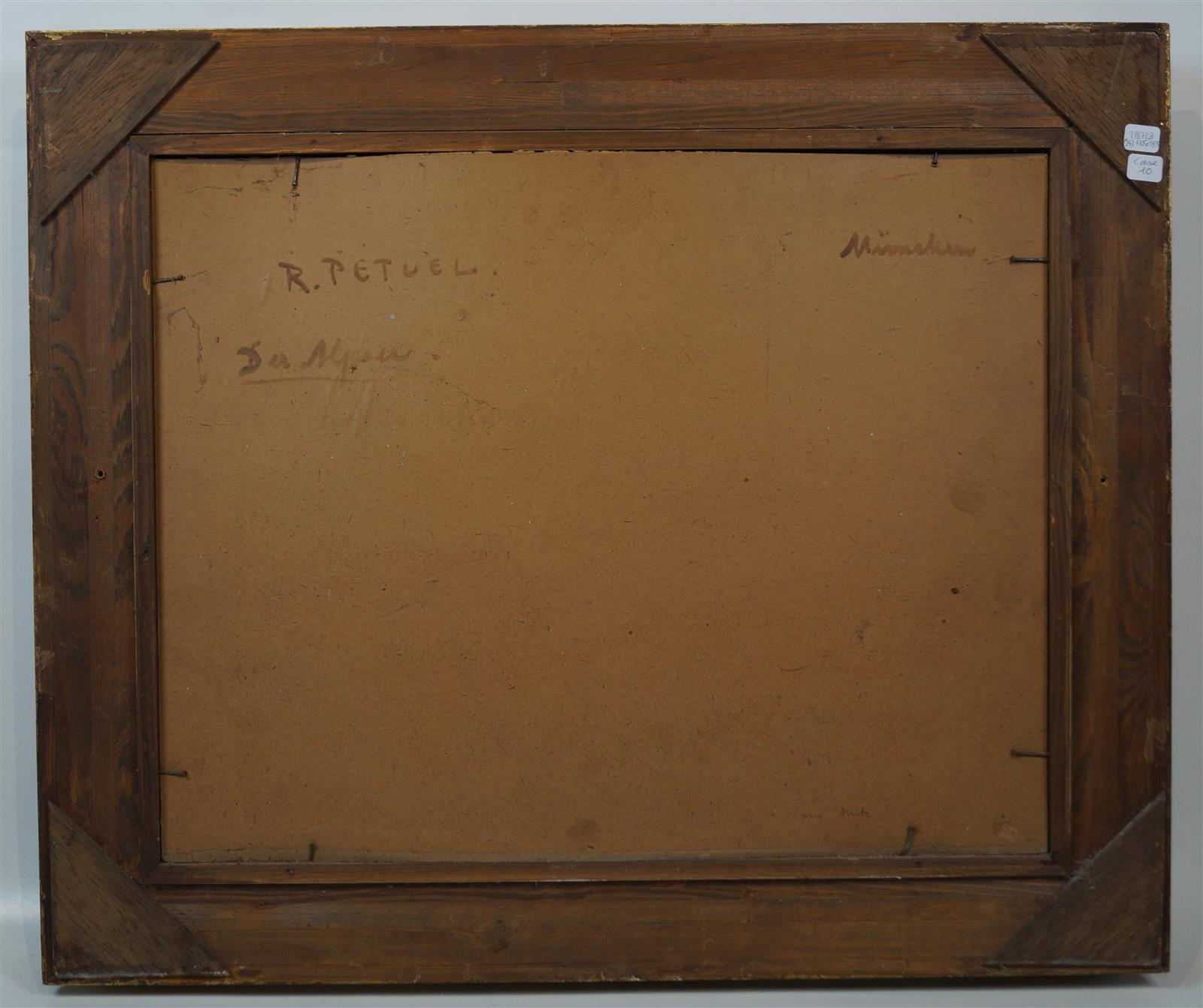 Rudolf PETUEL (1870-1937), "Munich, vue sur les Alpes", huile sur carton, signée en bas à droite, située au dos, 43,5 x 55,5 cm (carton gondolé en haut).