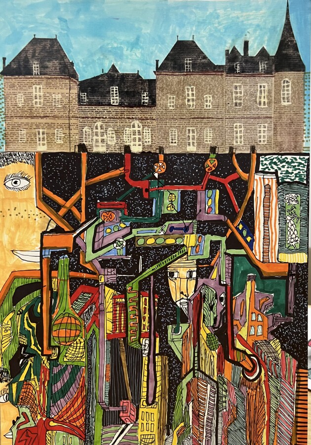 Ruichen GAO, "New-York souterrain", dessin et aquarelle sur papier, 26.5 x 38 cm. * Cocréation avec Malgorzata Paszko.