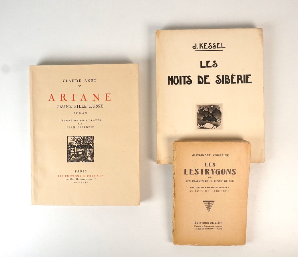 [RUSSIE] - Ensemble de 3 volumes brochés : ANET (Claude) - Ariane jeune fille russe - Paris ; Éditions G. Crès et Cie, 1924 - In-8° - Couverture rempliée, 1er plat illustré d'1 vignette, ouvrage en partie non coupé - Bois gravés de Jean Lébédeff in et hors texte - Très bon exemplaire numéroté sur vélin pur fil du Marais - KESSEL (Joseph) - Les nuits de Sibérie - Paris ; Ernest Flammarion, 1928 - In-8° - Couverture repliée - Eaux-fortes hors texte de Alexeiff - Très bon exemplaire numéroté sur vélin de Rives (n°218 sur 750, tirage total : 850 + 40 hors commerce) - KOUPRINE (Alexandre) - Les Lestrygons ou les charmes de la Russie du sud - Paris. Éditions de l'Épi, 1924 - In-12° - 1er mors fendu, le 2nd partiellement, titre manquant - 89 bois in et hors texte par Jean Lébédeff.