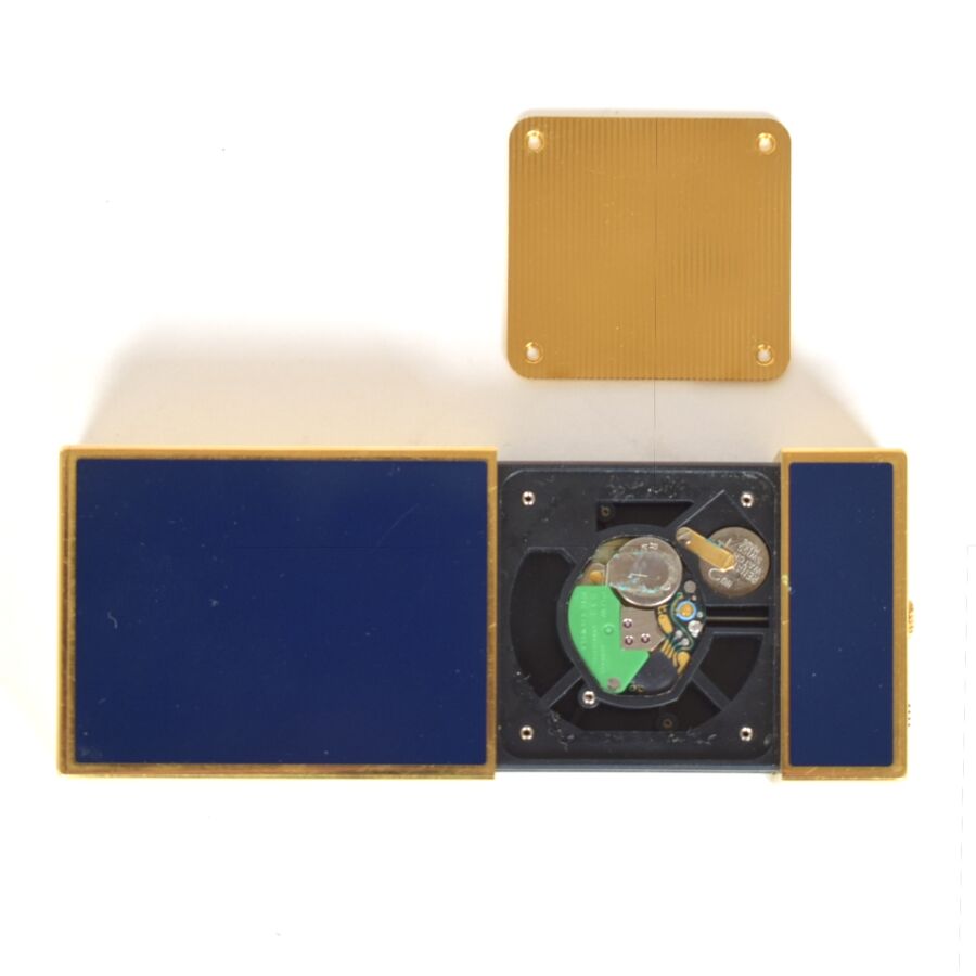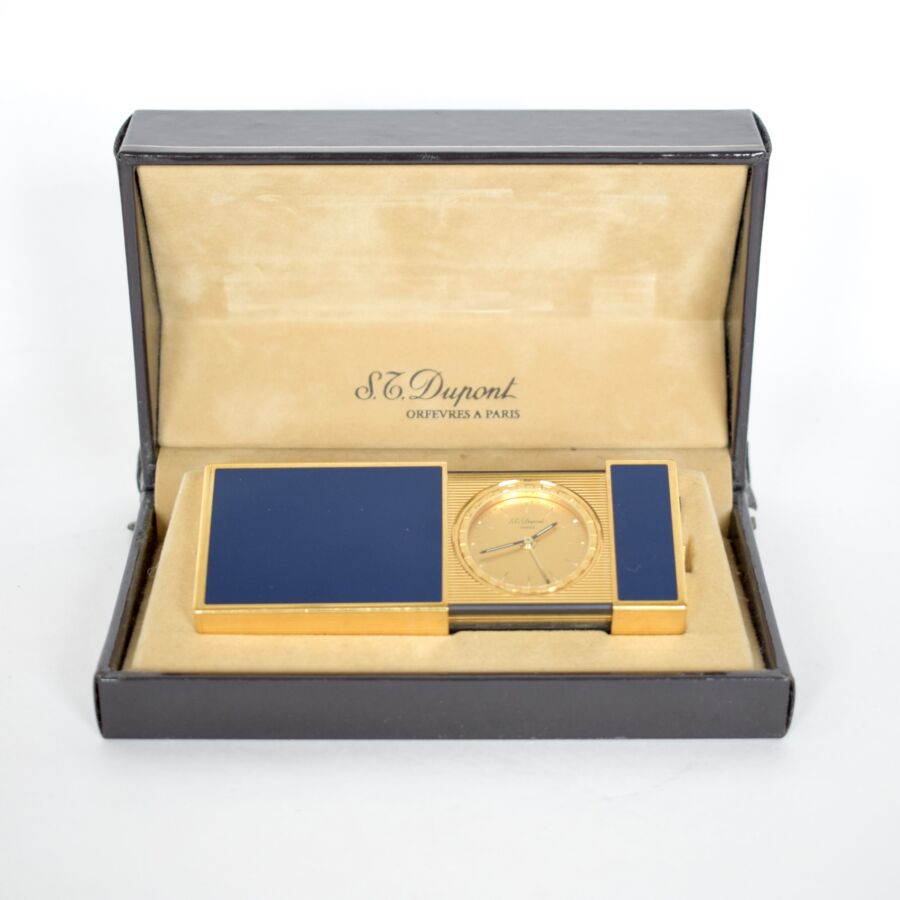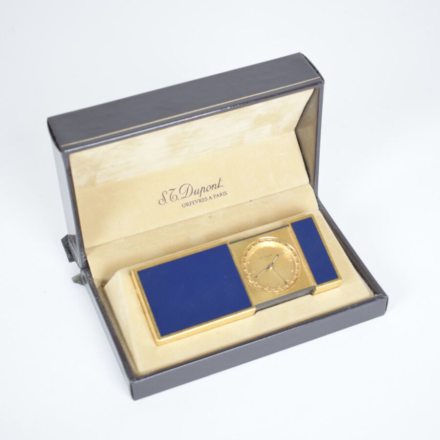 S.T. DUPONT : Réveil de voyage en métal doré et laque de Chine bleu, reprenant la forme d'un briquet, la partie supérieure coulissante sur un cadran à fond doré strié, présenté dans son écrin, (usures). H. 6 cm