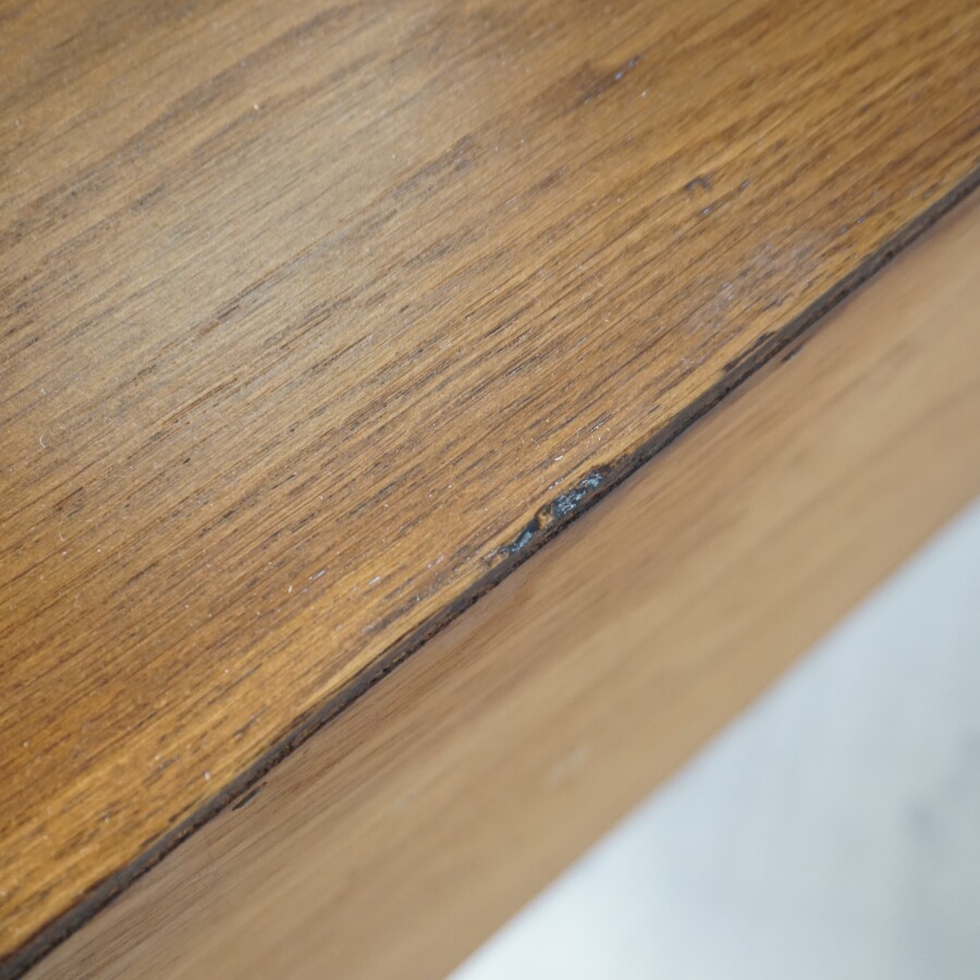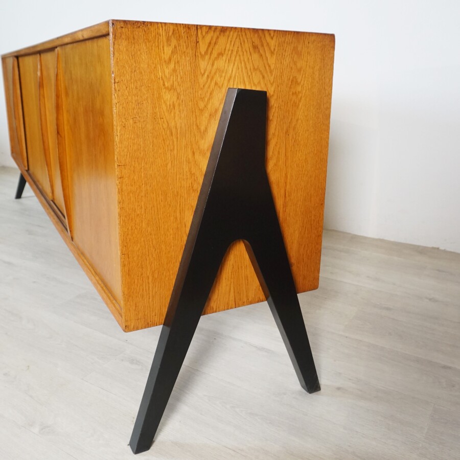 S.T.M DANEMARK : Enfilade en chêne ouvrant à trois vantaux dégageant des casiers, piètement compas en bois noirci, Danemark, circa 1960, H. 71.5 cm x L. 195 c m x P. 40.3 cm (petites usures d'usage).