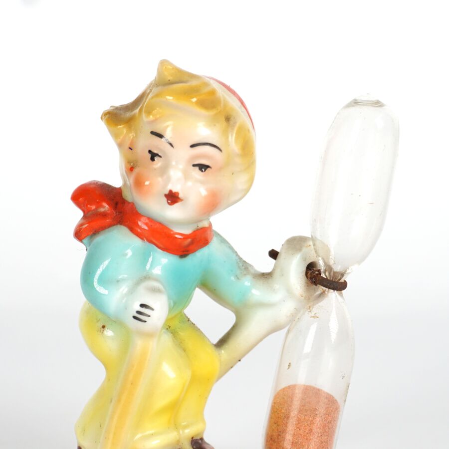 Sablier en porcelaine émaillée polychrome figurant une skieuse, Allemagne, circa 1930, H. 8 cm.