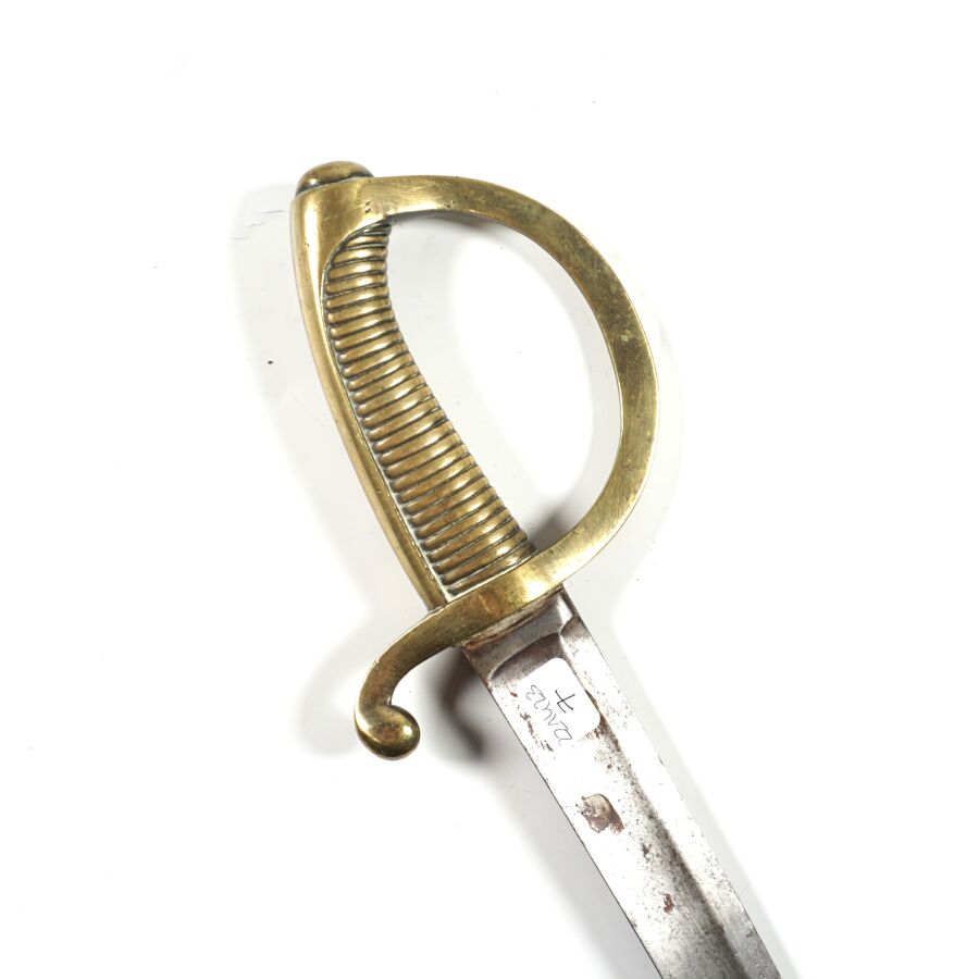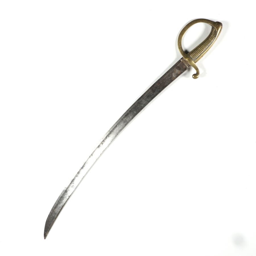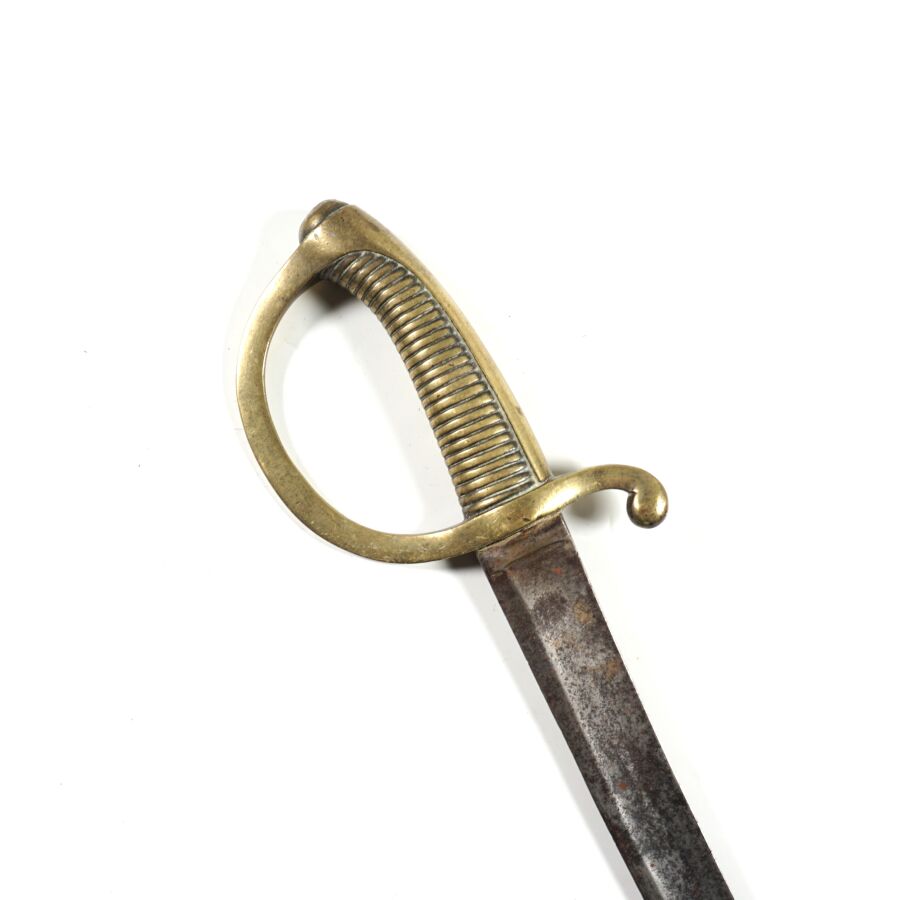 SABRE BRIQUET D'INFANTERIE TYPE MODELE AN XI, monture en laiton à une branche, poignée cannelée. Lame piquée à faible courbe de 62 cm à pans creux et fines gouttières, sans fourreau, EM.