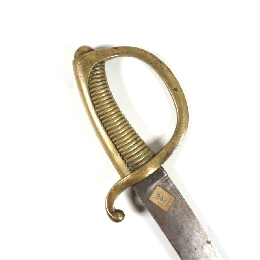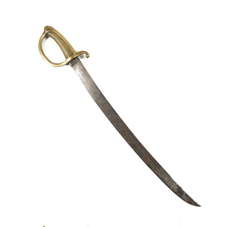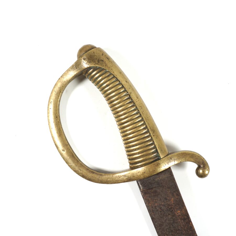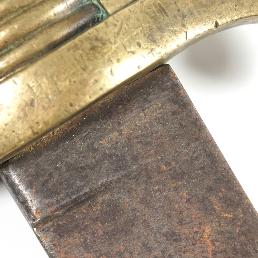 SABRE BRIQUET D'INFANTERIE TYPE MODELE AN XI, monture en laiton à une branche, poignée cannelée. Lame à faible courbe de 60 cm à un tranchant et dos plat (accident), poinçonnée et marquée " PRADIER " au talon, EM/ABE.