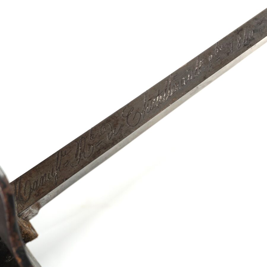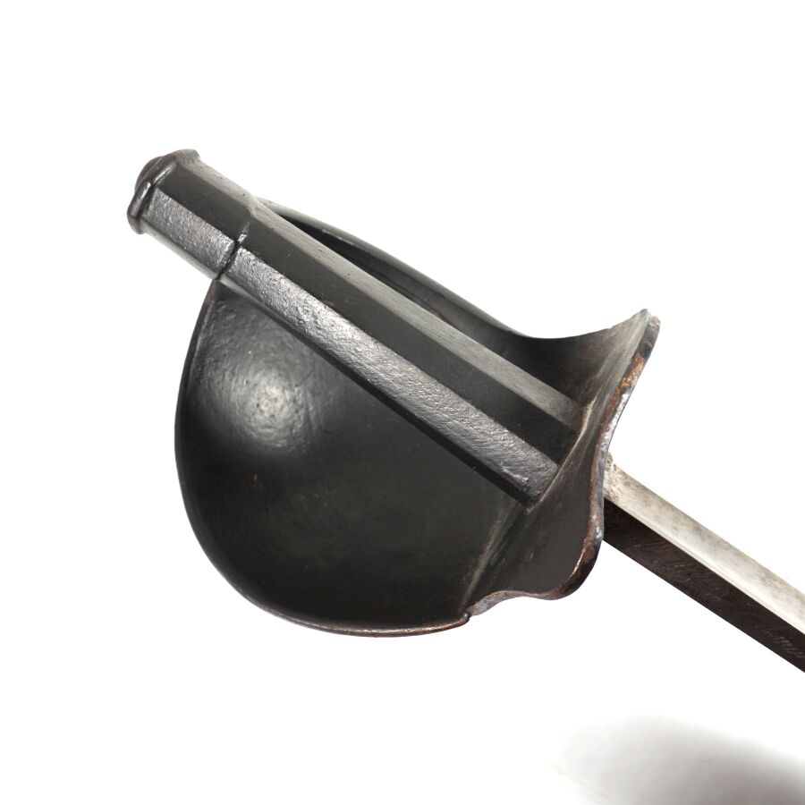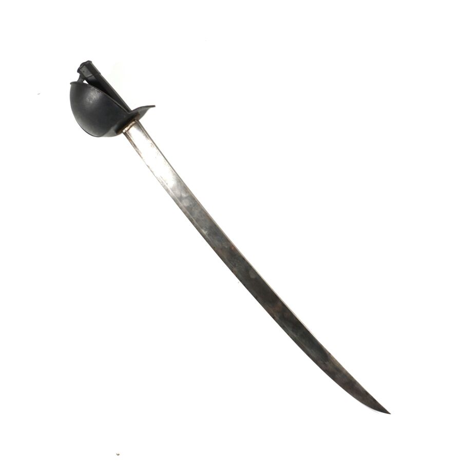 SABRE DE BORD ou D'ABORDAGE DIT CUILLERE MODELE 1833, poignée à pans et garde enveloppante à coquille en fer (repeint), lame courbe légèrement oxydée de 67 cm à pans creux, ancre de marine gravée de chaque côté, marquages du dos plat " Manufre Rle de Chatellerault 8bre 1840 ", sans fourreau, ABE/BE.