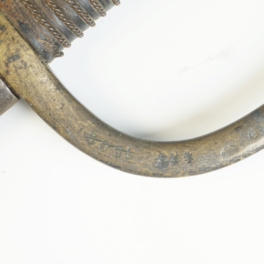 SABRE DE CANNONIER MONTE POUR LA TROUPE MODELE 1829, monture en laiton à une branche plate matriculée, poignée en bois gainé de basane et filigrane en fils de laiton torsadés, calotte à courte queue, petit quillon recourbé terminé par un bouton. Lame courbe à pans creux de 80 cm, dos plat marqué " Manufre Nle de Châtellerault 8bre 1849 ", fourreau piqué en tôle à deux bracelets et anneaux de suspente, à nettoyer, ABE.