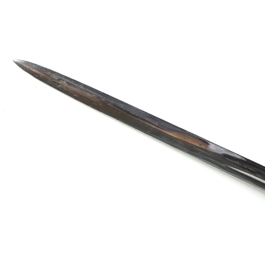 SABRE DE CAVALERIE LEGERE 1822 III REPUBLIQUE, monture en laiton à trois branches, poignée cannelée sans filigrane accidentée. Belle lame droite d'environ 86.5 cm à pans creux et gouttière, marquée sur dos plat " Mre d'armes de Chatelleraut juillet 1883 - Cavalerie légère modèle 1822 année 1883 ", fourreau en fer patine grise, à un bracelet et anneau de suspente, matricule A5220 présent sur l'anneau de fourreau et sur l'une des branches de la garde, BE.