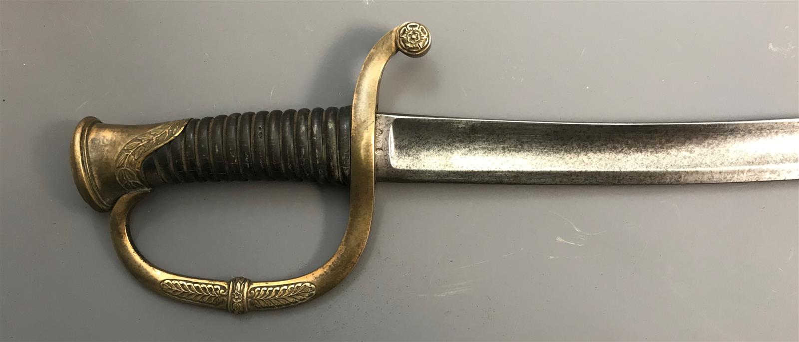 SABRE D'OFFICIER DE CANNONIER MONTE MODELE 1829, monture en laiton à une branche plate à décor palmettes, poignée cannelée en corne brune sans filigrane, calotte à courte queue à décor de feuilles de laurier en frise, petit quillon recourbé terminé par un bouton. Lame courbe piquée à pans creux de 81 cm, sans fourreau, jeu dans la monture, ABE.