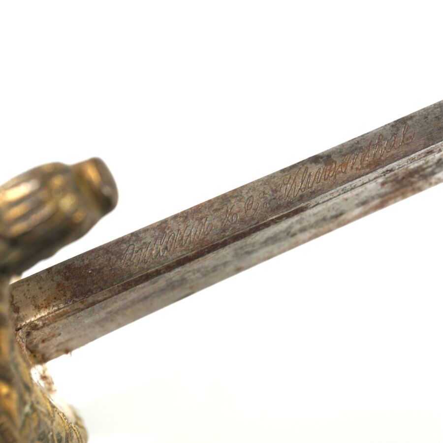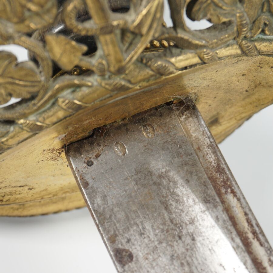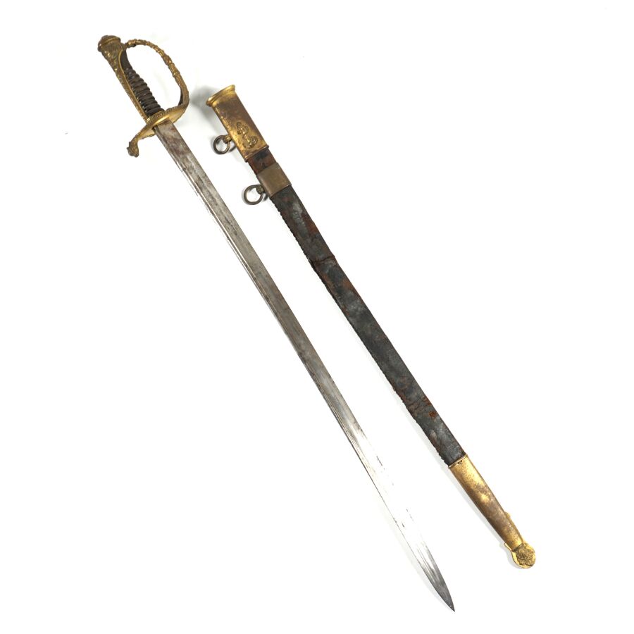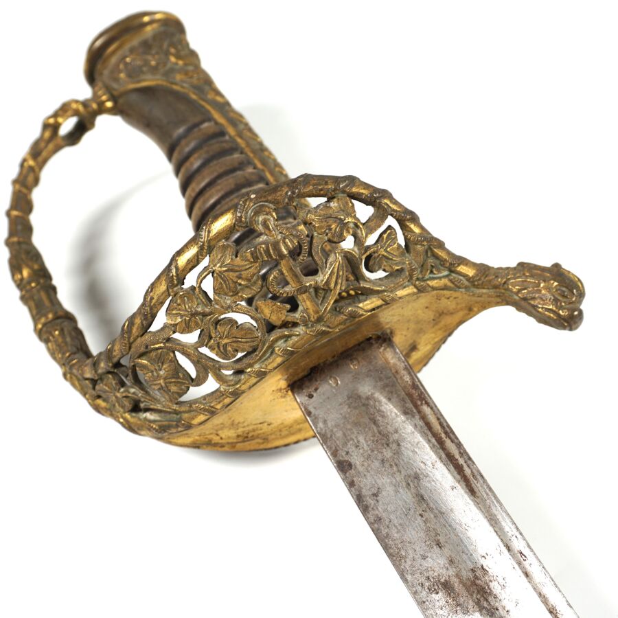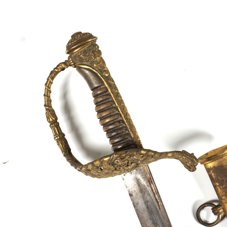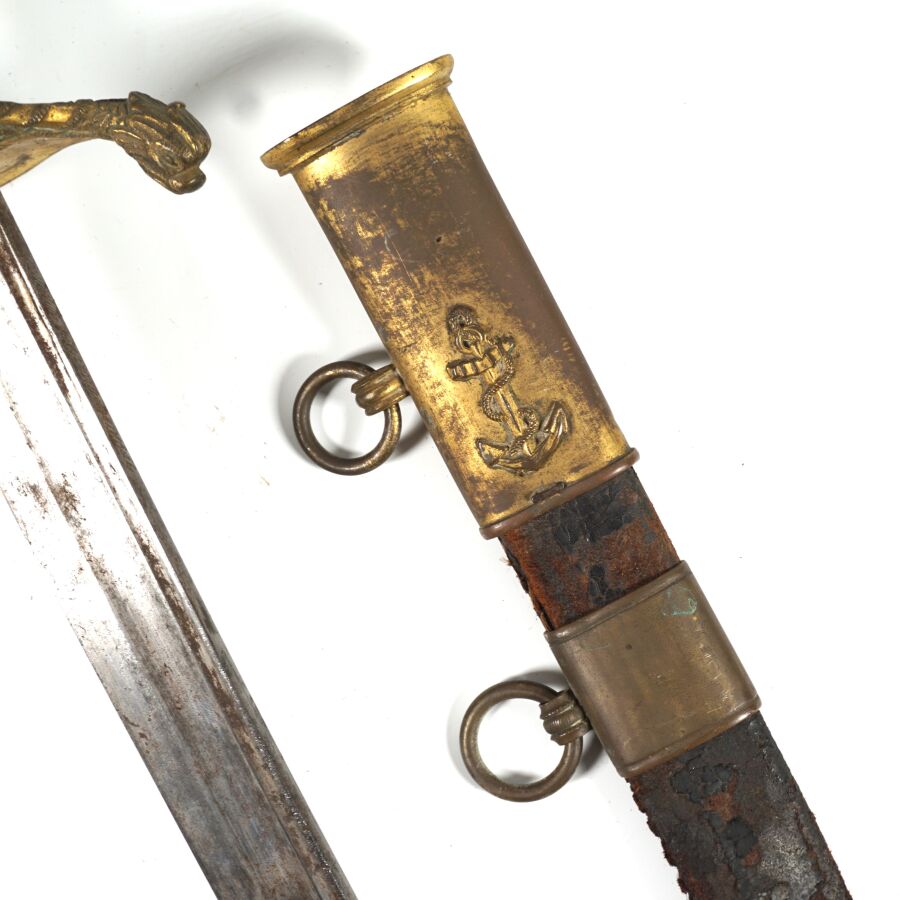 SABRE D'OFFICIER DE MARINE MODELE 1837 III REPUBLIQUE, monture ouvragée en laiton doré à décor de feuilles de chêne et d'une ancre de marine cablée, poignée cannelée en corne brune, calotte à longue queue à décor de coquilles Saint-Jacques en suite, quillon en forme de monstre marin. Lame piquée de 69 cm à pans creux et gouttières, fourreau en cuir noir en mauvais état à garnitures en laiton doré à deux anneaux de suspente, début XXème, EM.