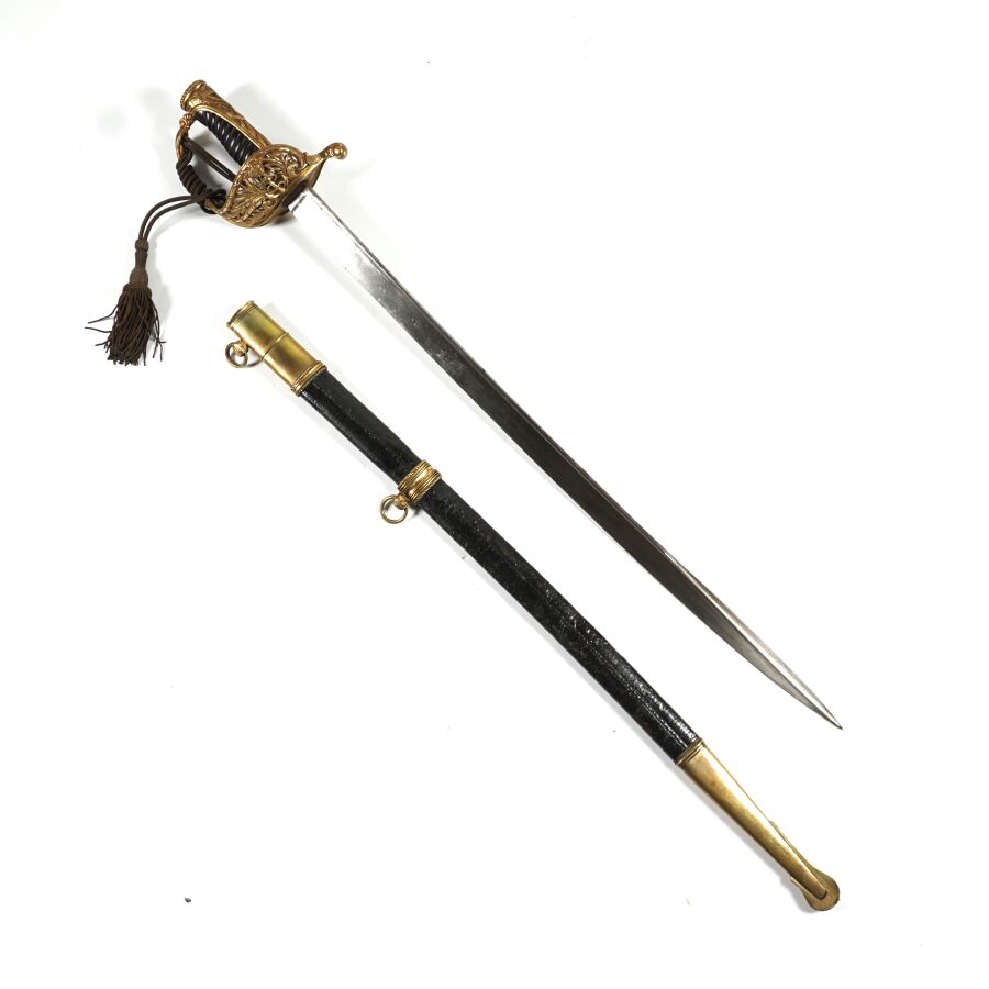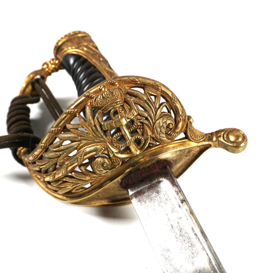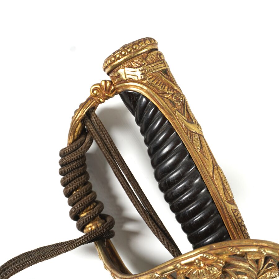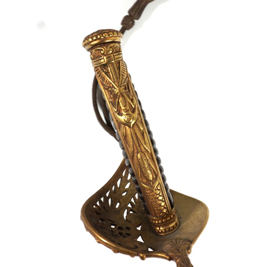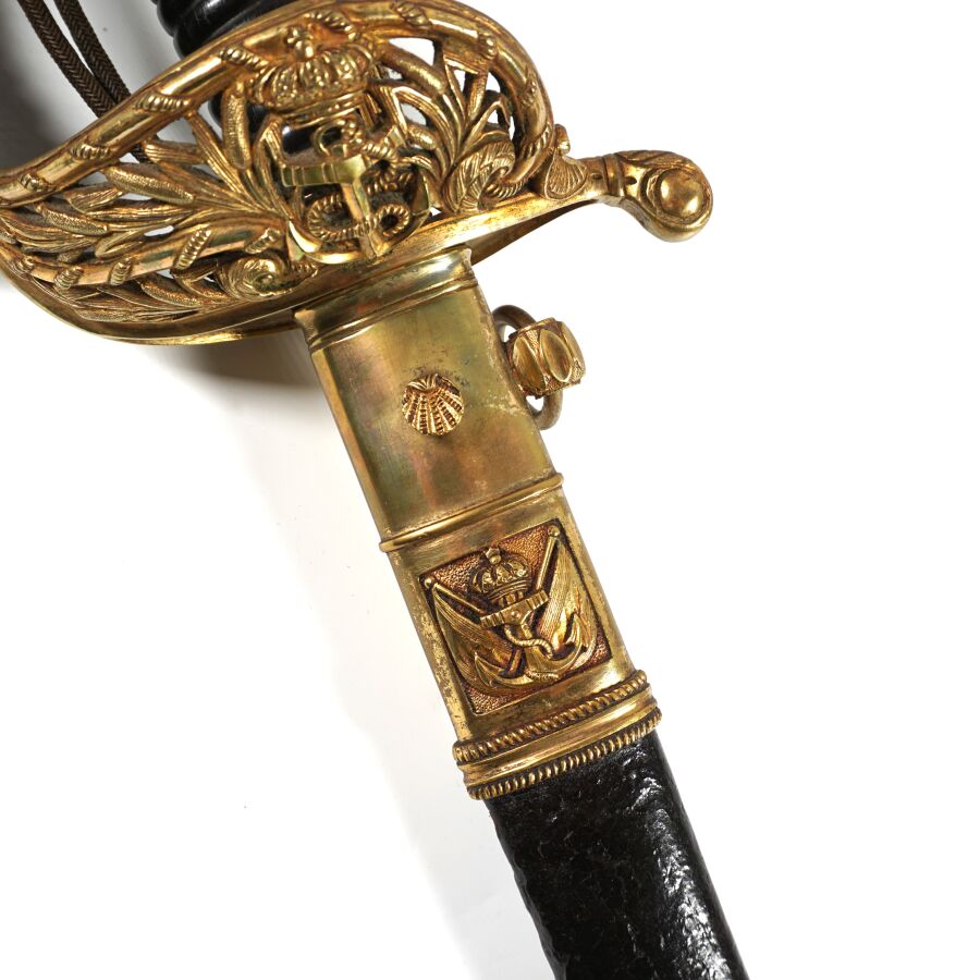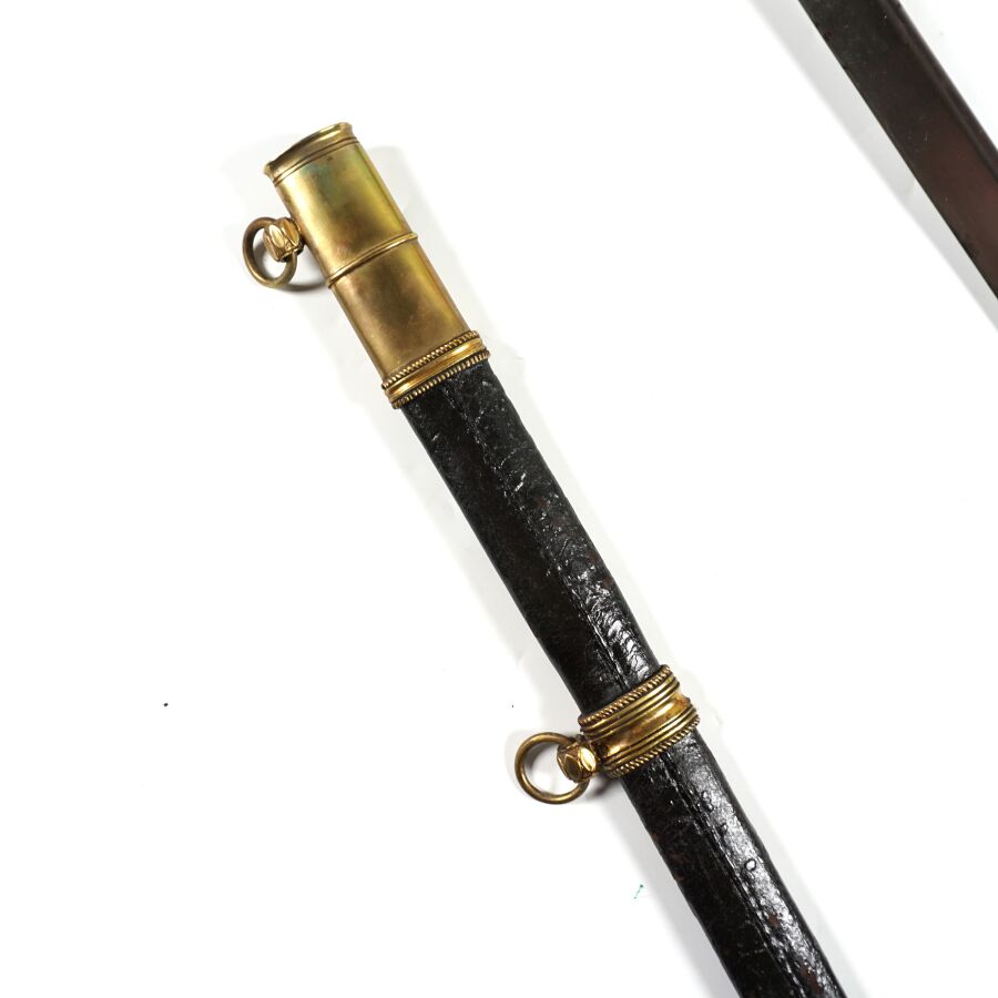 SABRE D'OFFICIER DE MARINE MODELE 1837 SECOND EMPIRE, monture ciselée et ouvragée en laiton doré à décor d'ancre de marine étalinguée couronnée et de feuillage de roseaux, calotte à longue queue à décor de motifs floraux dont roseaux, poignée cannelée en oblique en corne brune, quillon plat se terminant en rosace. Lame piquée sans marquages très légèrement courbe de 65 cm à contre-tranchant en langue de carpe en pointe, fourreau en cuir noir à garnitures en laiton doré, DRAGONNE en cannetille dorée, BE.