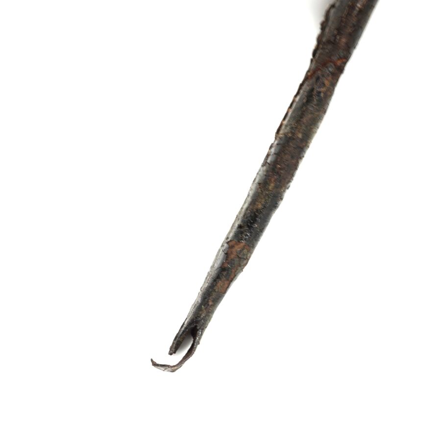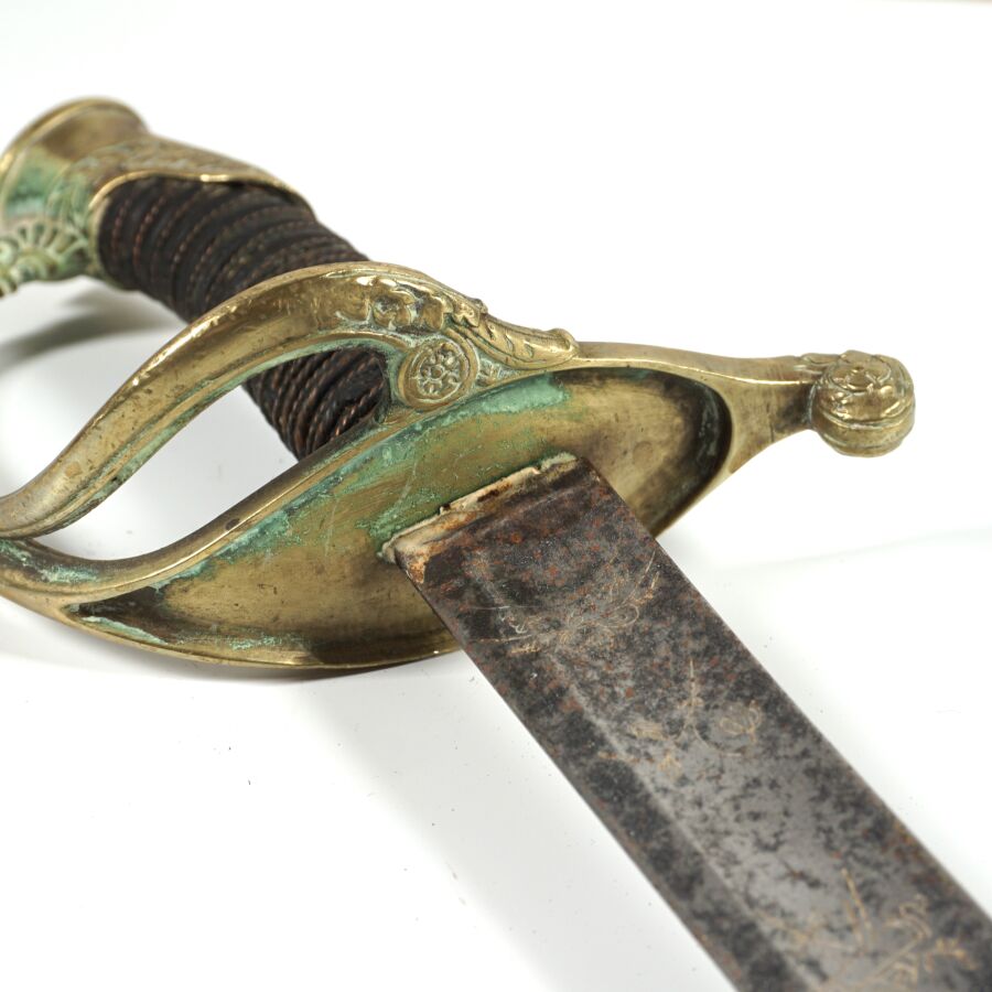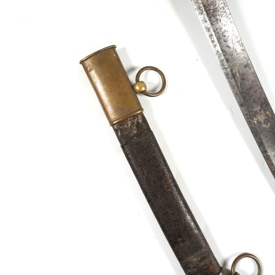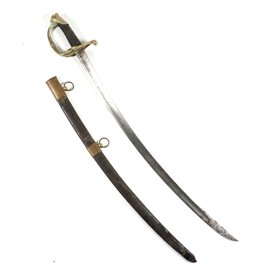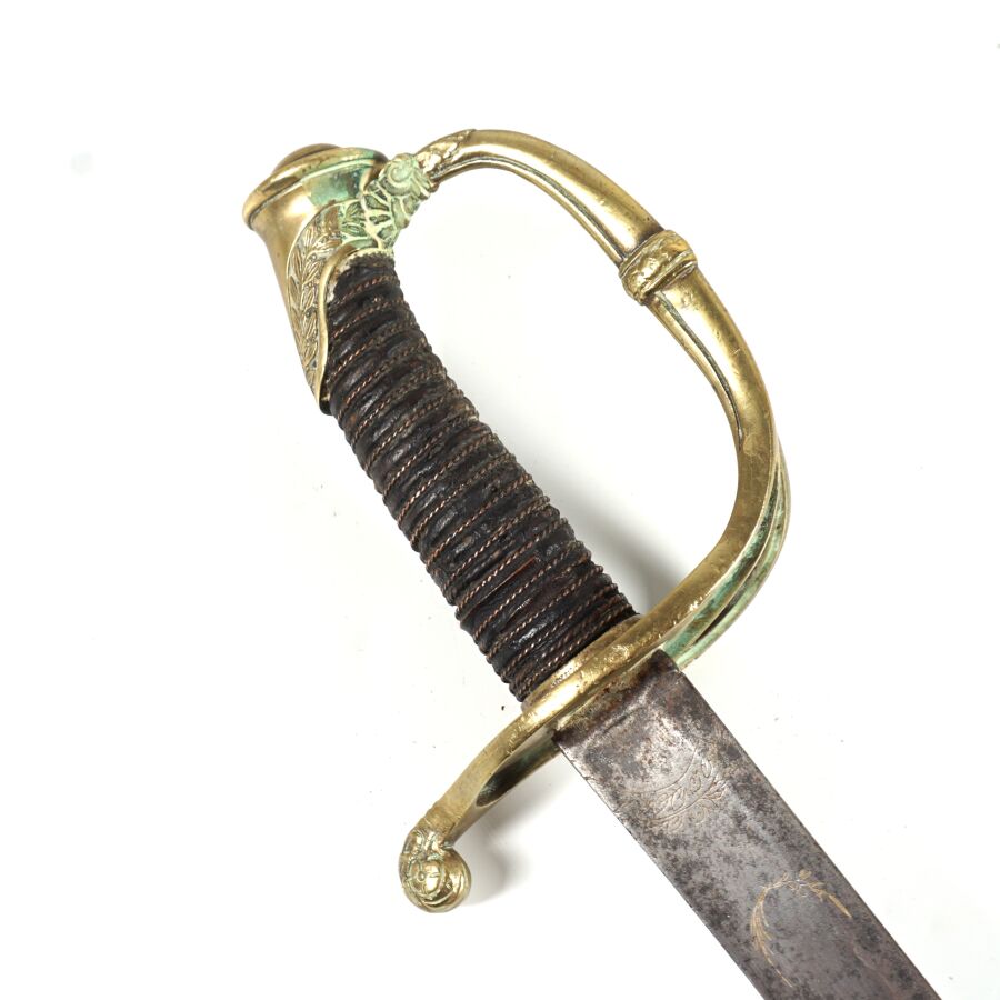 SABRE D'OFFICIER D'INFANTERIE MODELE 1821, monture en laiton ciselé à une branche principale et une secondaire à décor de feuillage, poignée en bois gainée de basane à filigrane en fils de cuivre torsadés, calotte à courte queue. Lame courbe de 76 cm piquées par endroits à pans creux et dos plat, gravée au premier tiers de symbole militaires, fourreau en cuir noir craquelé en mauvais état à garnitures en laiton et à deux bracelets et anneaux de suspente, manque la bouterolle, DANS L'ETAT.