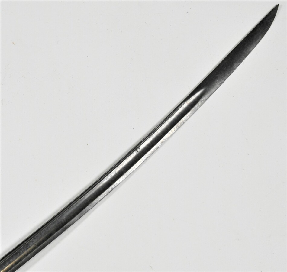 SABRE D'OFFICIER D'INFANTERIE MODELE 1821, monture en laiton à une branche principale, poignée cannelée en corne sans filigrane, petit quillon recourbé. Lame piquée de 75 cm pans creux, fourreau en cuir noir à garnitures en laiton et à deux anneaux de suspente, manque la bouterole, EM.