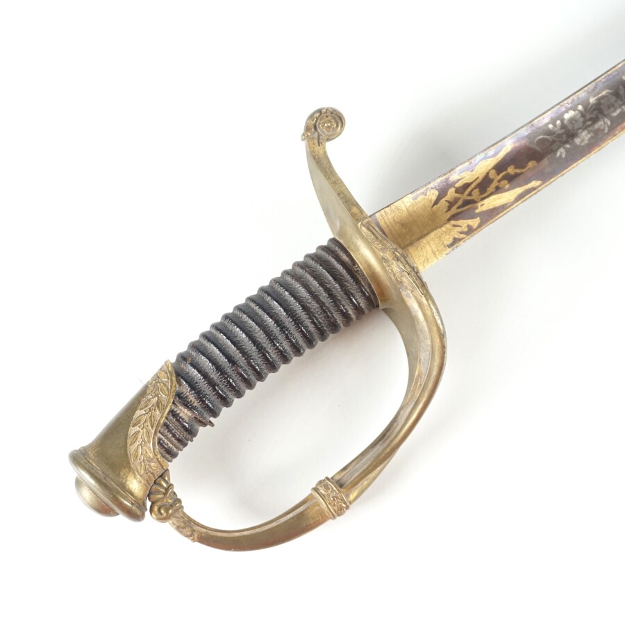 SABRE D'OFFICIER D'INFANTERIE MODELE 1821, monture en laiton doré ciselé à une branche principale et une secondaire à décor de feuillage, poignée noire cannelée en bois gainée de basane avec restant de filigrane, calotte à courte queue. Lame courbe piquée de 76 cm à pans creux, fines gouttières et dos plat, gravée à l'or de symboles militaires et bleuie au premier tiers, fourreau en cuir noir accidenté à garnitures en bronze doré ciselé et à un bracelet et anneau de suspente (manque un des deux bracelets), ABE/BE.