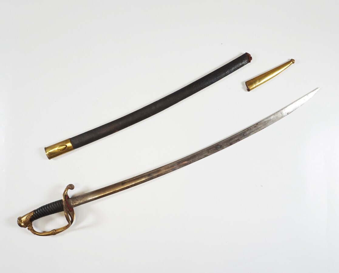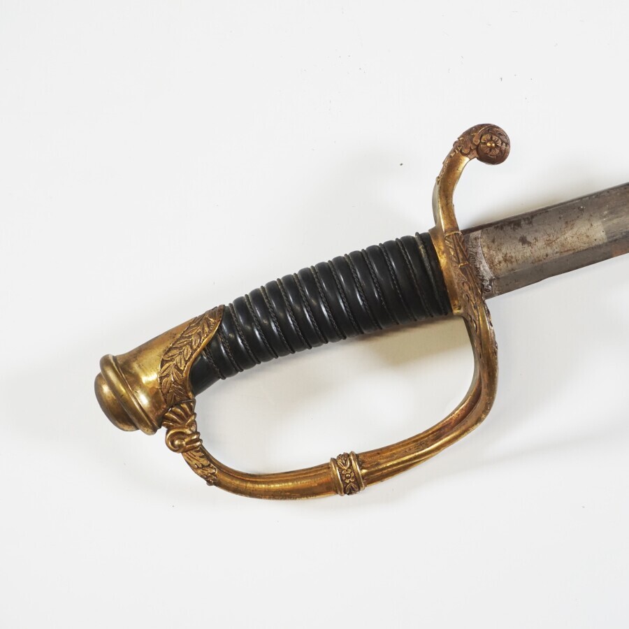 SABRE D'OFFICIER D'INFANTERIE MODELE 1821, monture en laiton doré ciselé à une branche principale et une secondaire à décor de feuillage, poignée noire cannelée en bois avec filigrane constitué de fils métalliques torsadés, calotte à courte queue. Lame courbe piquée de 76 cm à pans creux, fines gouttières et dos plat, fourreau en cuir noir accidenté au-dessus de la bouterolle à garnitures en bronze doré ciselé, ABE/BE.