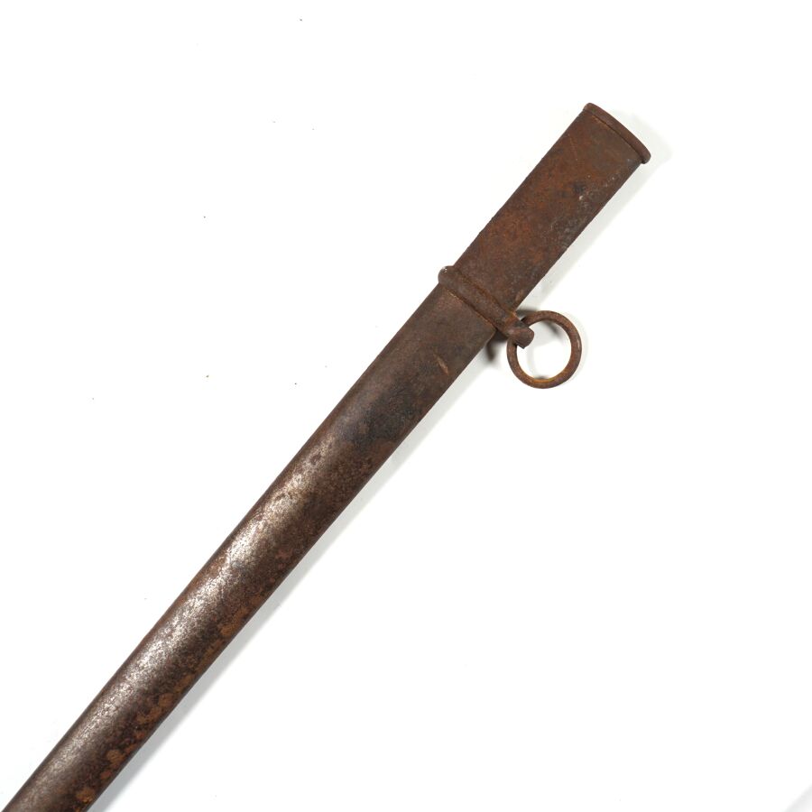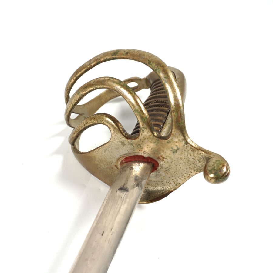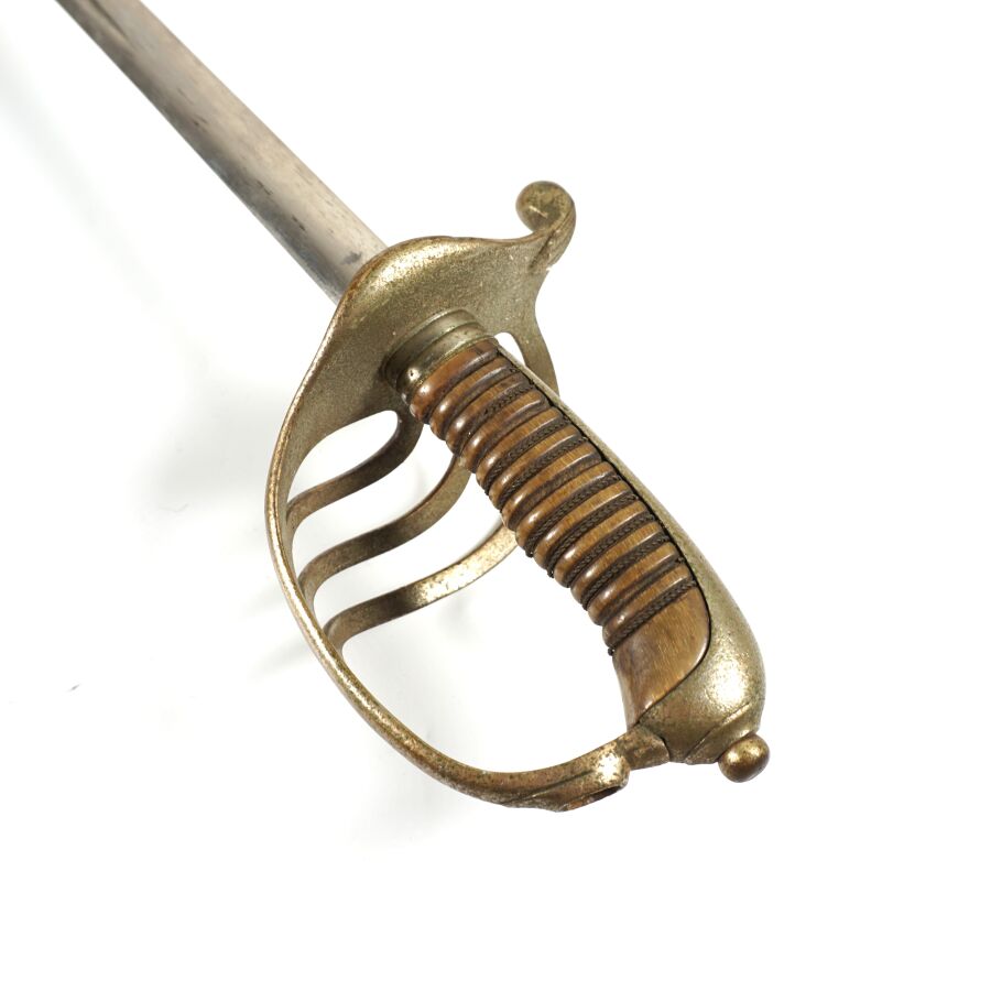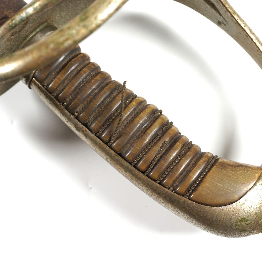 SABRE D'OFFICIER D'INFANTERIE MODELE 1882, monture nickelée à 4 branches, poignée cannelée en corne blonde et filigrane métallique torsadé, calotte à longue queue, petit quillon recourbé. Lame droite de 81 cm à gouttières, fourreau fortement piqué en fer à un bracelet et anneau de suspente, EM.
