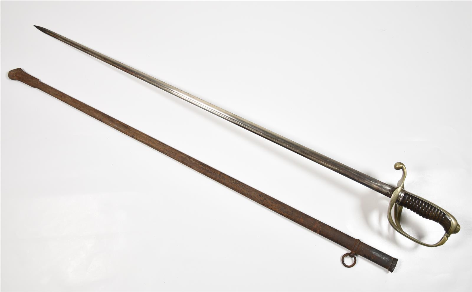 SABRE D'OFFICIER D'INFANTERIE MODELE 1882, monture nickelée à 4 branches, poignée cannelée en corne brune sans filigrane, calotte à longue queue, petit quillon recourbé. Lame droite piquée à fines gouttières de 85 cm, fourreau piqué en tôle à un bracelet et anneau de suspente, ABE.