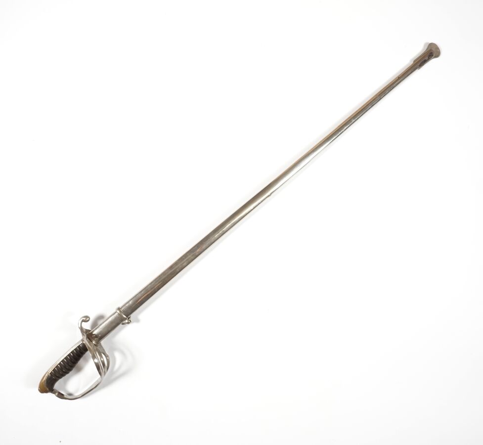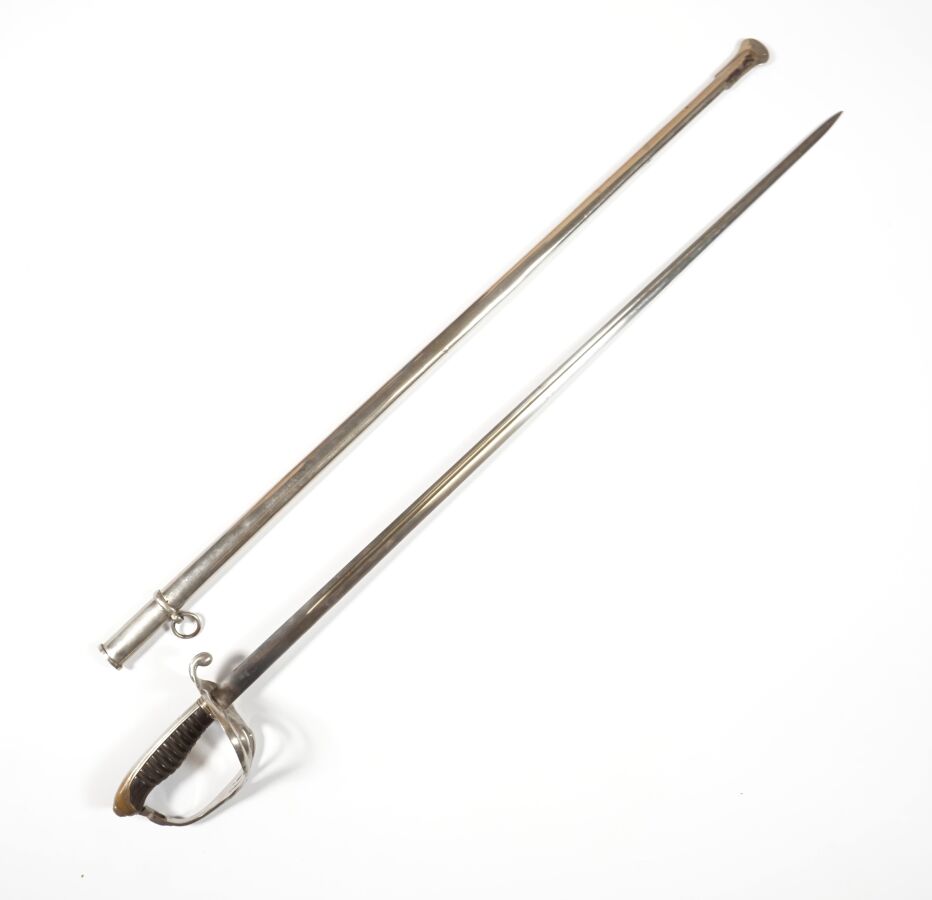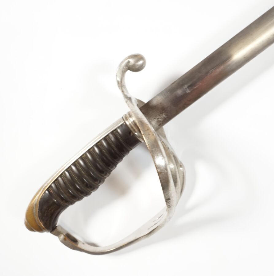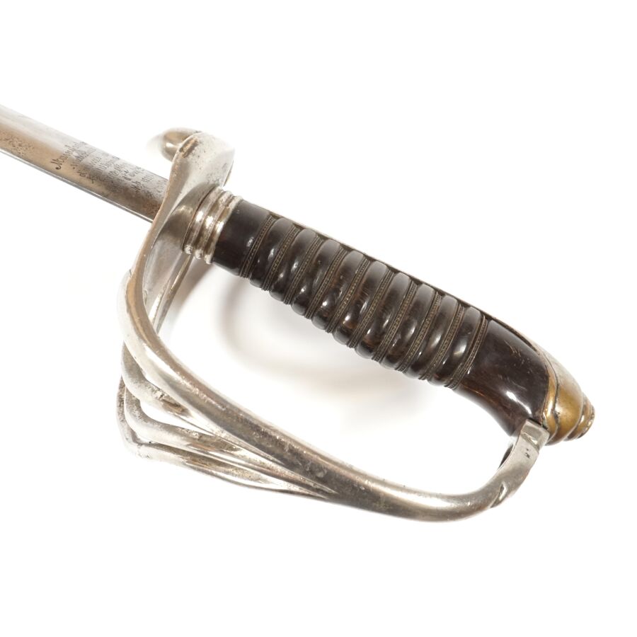 SABRE D'OFFICIER D'INFANTERIE MODELE 1882, monture nickelée (usure) à cinq branches, poignée cannelée en corne brune et filigrane en fils métalliques torsadés, calotte à longue queue, petit quillon recourbé. Lame droite de 85 cm à gouttière médiane, marquée au talon " Manufacture Nationale de Châtellerault Juillet 1914 Offier Infrie 1882 ", fourreau nickelé à un bracelet et anneau de suspente, BE.