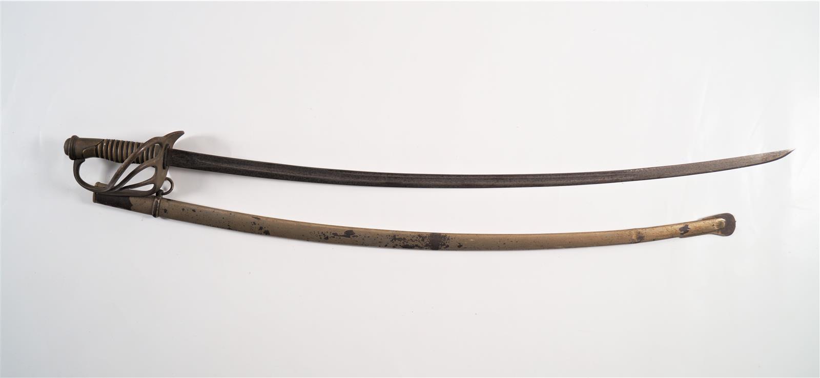 SABRE D'OFFICIER III REPUBLIQUE, monture en bronze à quatre branches, poignée cannelée en corne brune avec filigrane, calotte à courte queue. Lame courbe piquée de 89 cm à pans creux et fine gouttière centrale, lame marquée au talon " MANUFACTURE FRANCAISE D'ARMES ET CYCLES DE SAINT-ETIENNE ", fourreau chromé à un bracelet et anneau de suspente, à nettoyer, ETAT GRENIER.