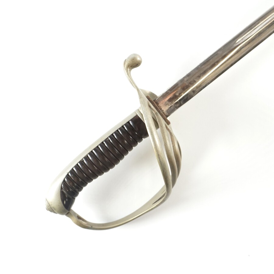 SABRE D'OFFICIER INFANTERIE MODELE 1882, monture en métal nickelé à quatre branches, poignée cannelée en corne brune sans filigrane, calotte à longue queue, petit quillon recourbé. Lame droite de 87 cm à double tranchant et fine gouttière médiane marquée au talon "Mre d'armes de Chât/Juin 1883/Off infrie model 1882 ", fourreau piqué en fer anciennement nickelé à un bracelet et anneau de suspente, ABE/BE.