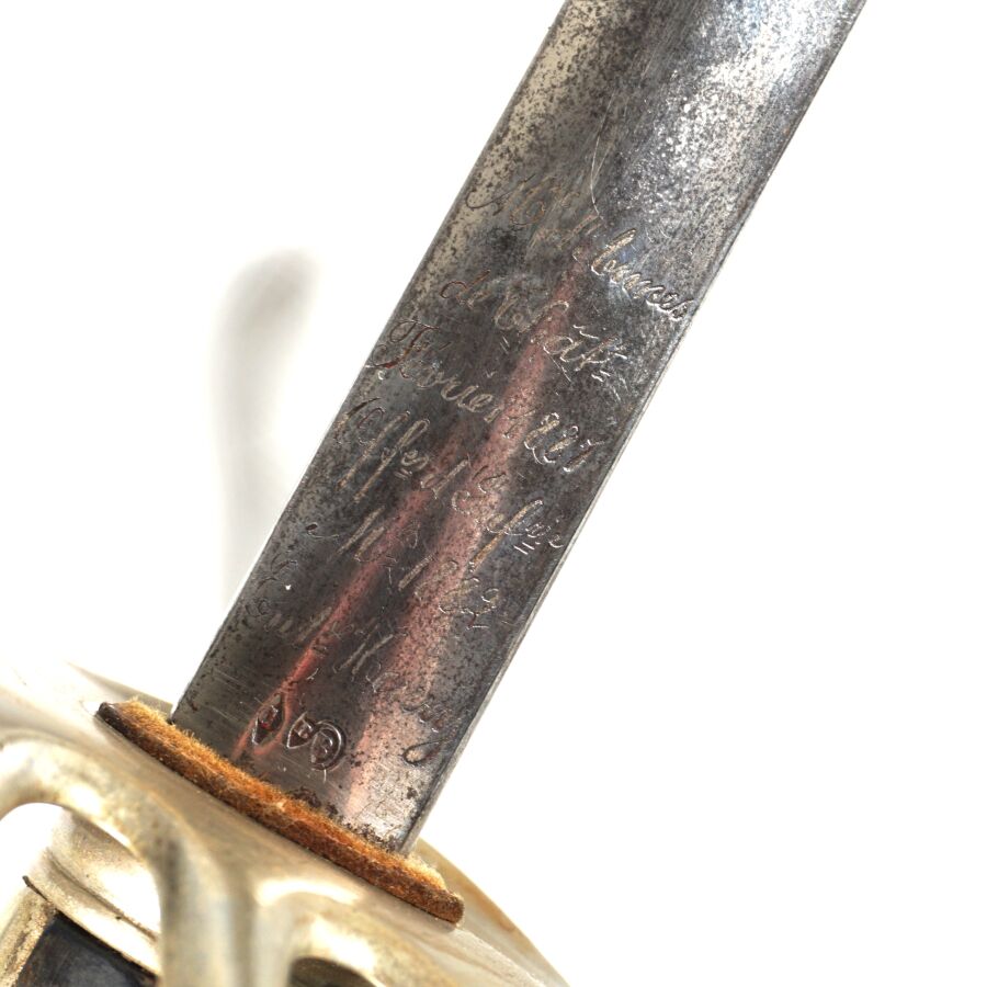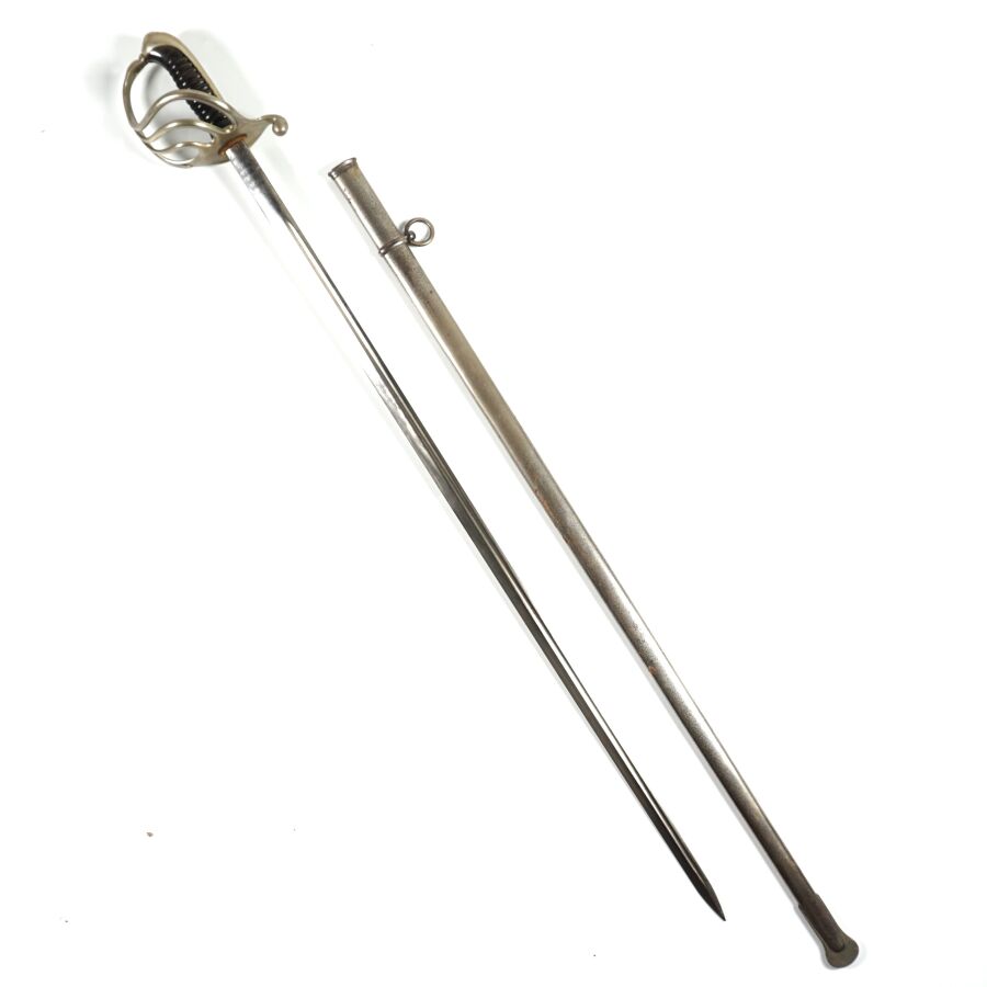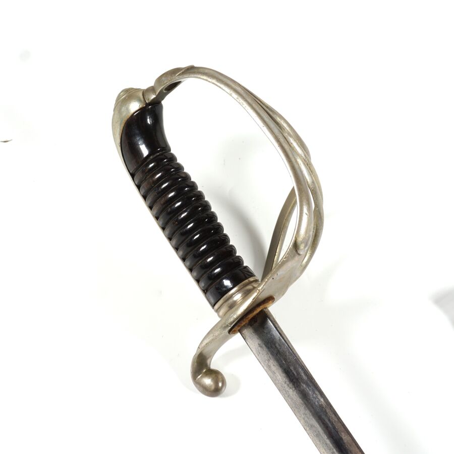 SABRE D'OFFICIER MODELE 1882, monture nickelée à cinq branches, poignée cannelée en corne noire sans filigrane, calotte à longue queue, petit quillon recourbe. Lame droite de 84 cm à gouttières, marquée au talon sur 6 lignes " Mre d'Armes de Châtt février 1887 Off d'Infrie Mle 1882 Entse Henry ", fourreau piqué en tôle de fer à un bracelet et anneau de suspente, ABE/BE.
