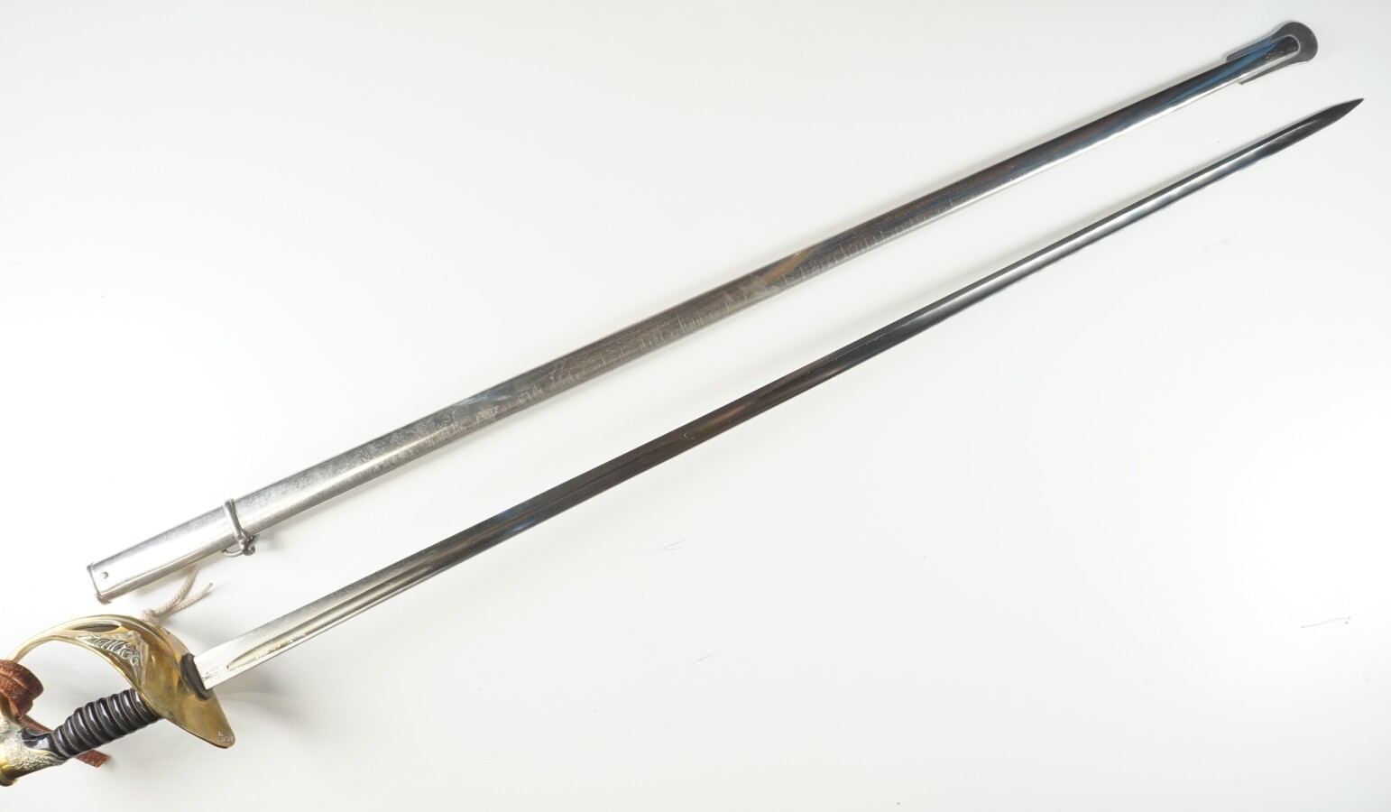 SABRE D'OFFICIER MODELE 1923, monture en bronze à trois branches, poignée cannelée en corne et filigrane en fils métalliques torsadés, calotte à courte queue. Lame droite de 89 cm à pans creux et dos plat marqué " BALP SAINT-ETIENNE ", fourreau chromé en tôle à un bracelet et anneau de suspente, BE.