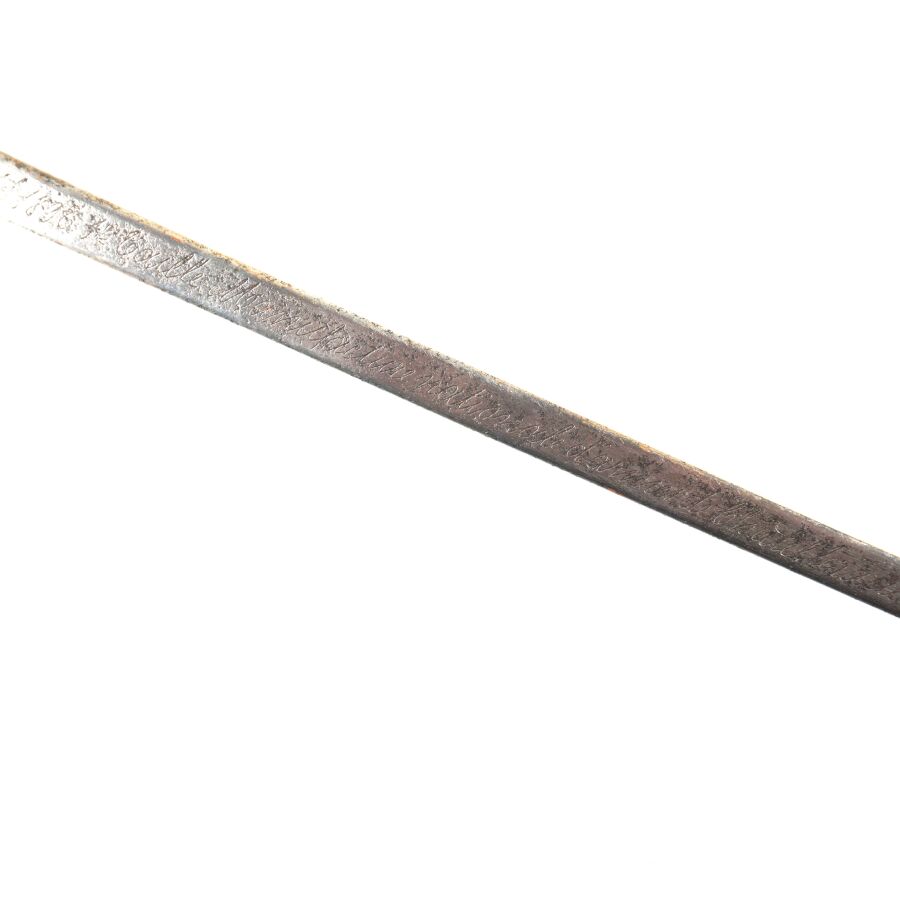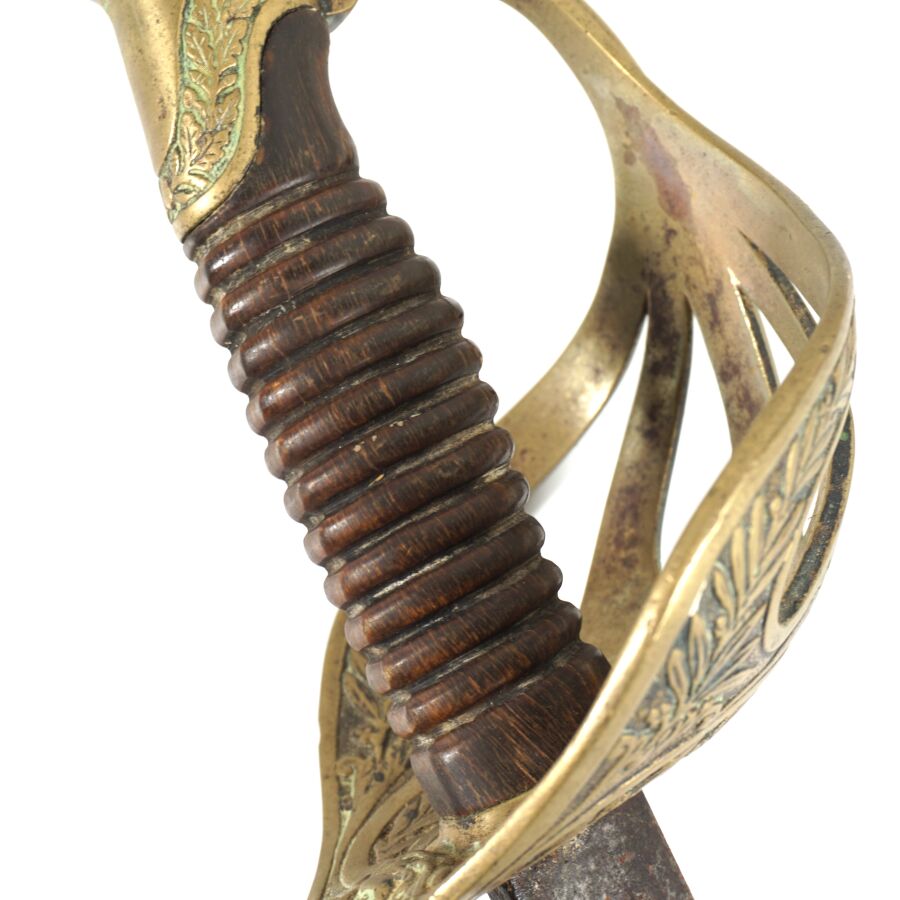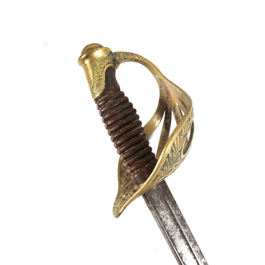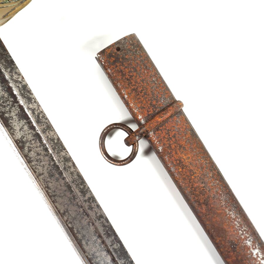 SABRE D'OFFICIER SUPERIEUR DE CAVALERIE MODELE 1896, monture en laiton à décor ciselé de feuilles et rameaux de laurier, calotte à courte queue, poignée noire cannelée et filigrane en fils de laiton torsadés, court quillon à décor d'une tête de méduse. Lame droite en mauvais état de X cm à pans creux et dos plats (marquages difficilement lisibles), fourreau en tôle de fer fortement piqué à un bracelet et anneau de suspente, début XX, DANS L'ETAT.