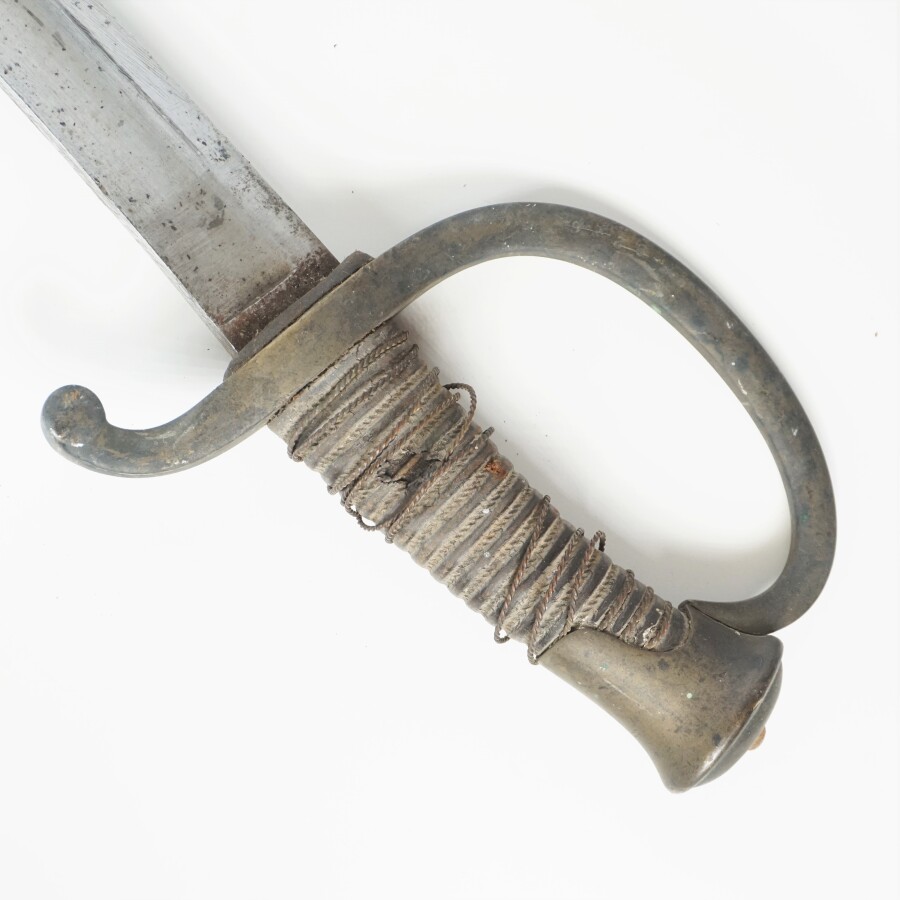 SABRE TROUPE DE CANONNIER MONTE MODELE 1829, monture en bronze à une branche matriculée " 360 ", poignée en bois gainée de basane, filigrane incomplet, calotte à courte queue, petit quillon recourbé. Lame courbe de 80 cm à pans creux et dos plat marqué " Manufre Nle de Châtellerault février 1852 ", fourreau oxydé en tôle à deux bracelets et anneaux de suspente, fabrication de la Seconde République, EM.
