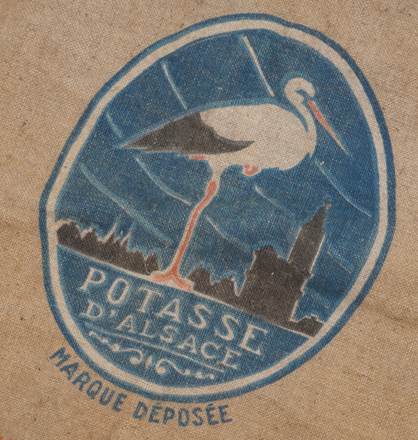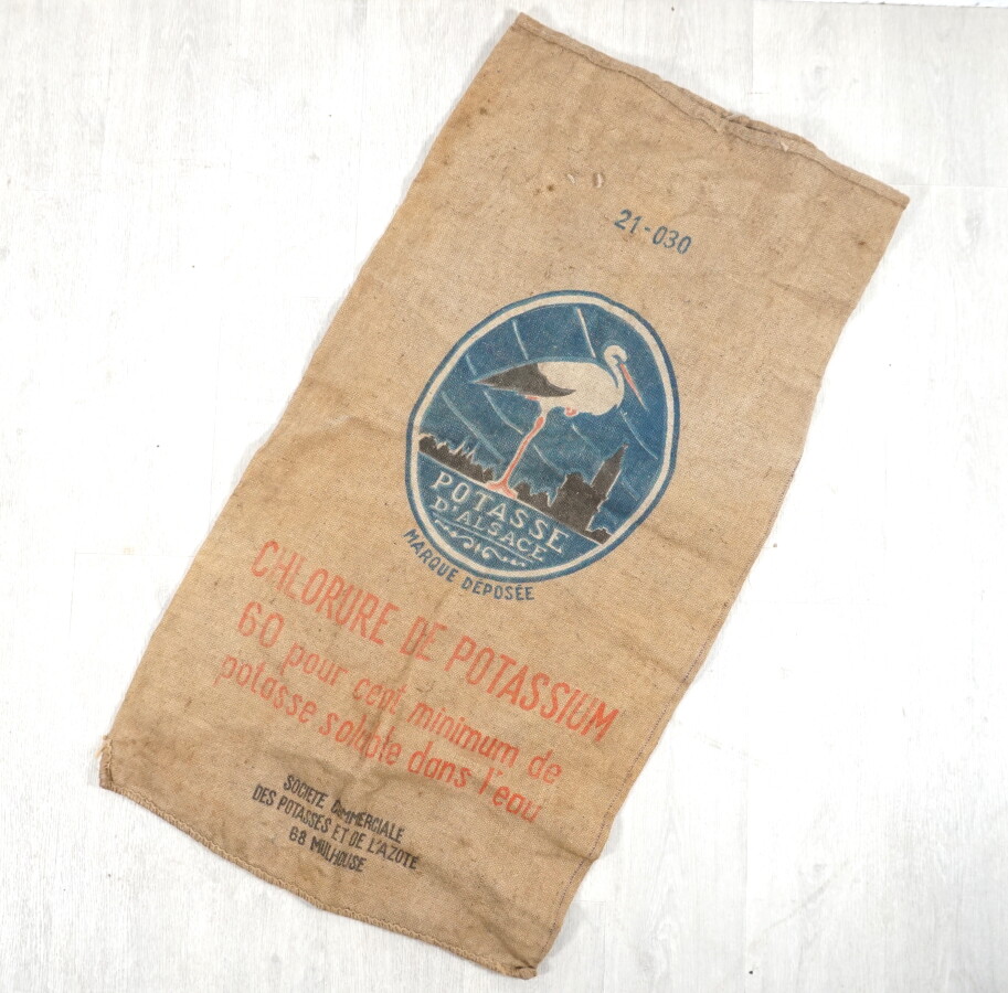 Sac en toile de Jute "Potasse d'Alsace", chlorure de potassium, société commerciale des potasses et de l'azote, H. 110 cm.
