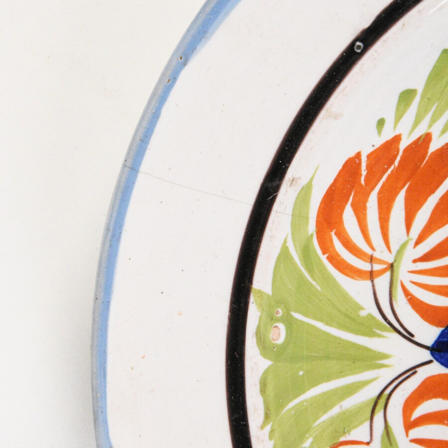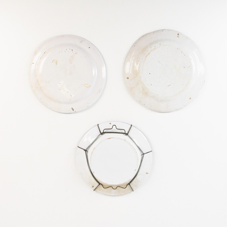 SAINT-CLEMENT : Trois assiettes en faïence émaillée polychrome, à décor au petit feu d'un panier fleuri, d'un médaillon floral et d'une devise "T'eneh vous vos prommesses", 19e siècle, D. 22 cm environ.