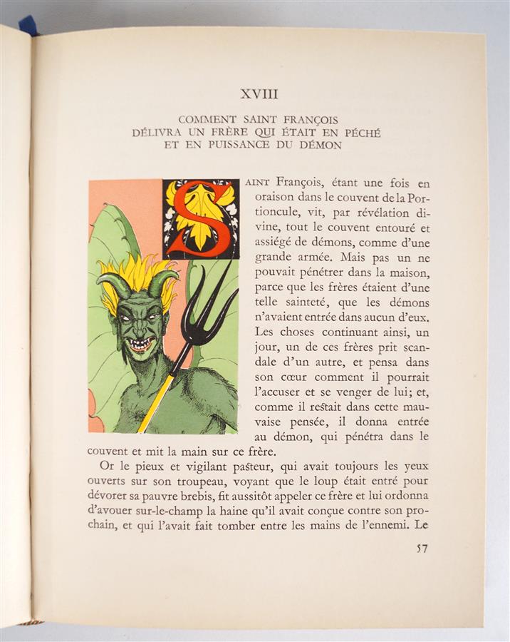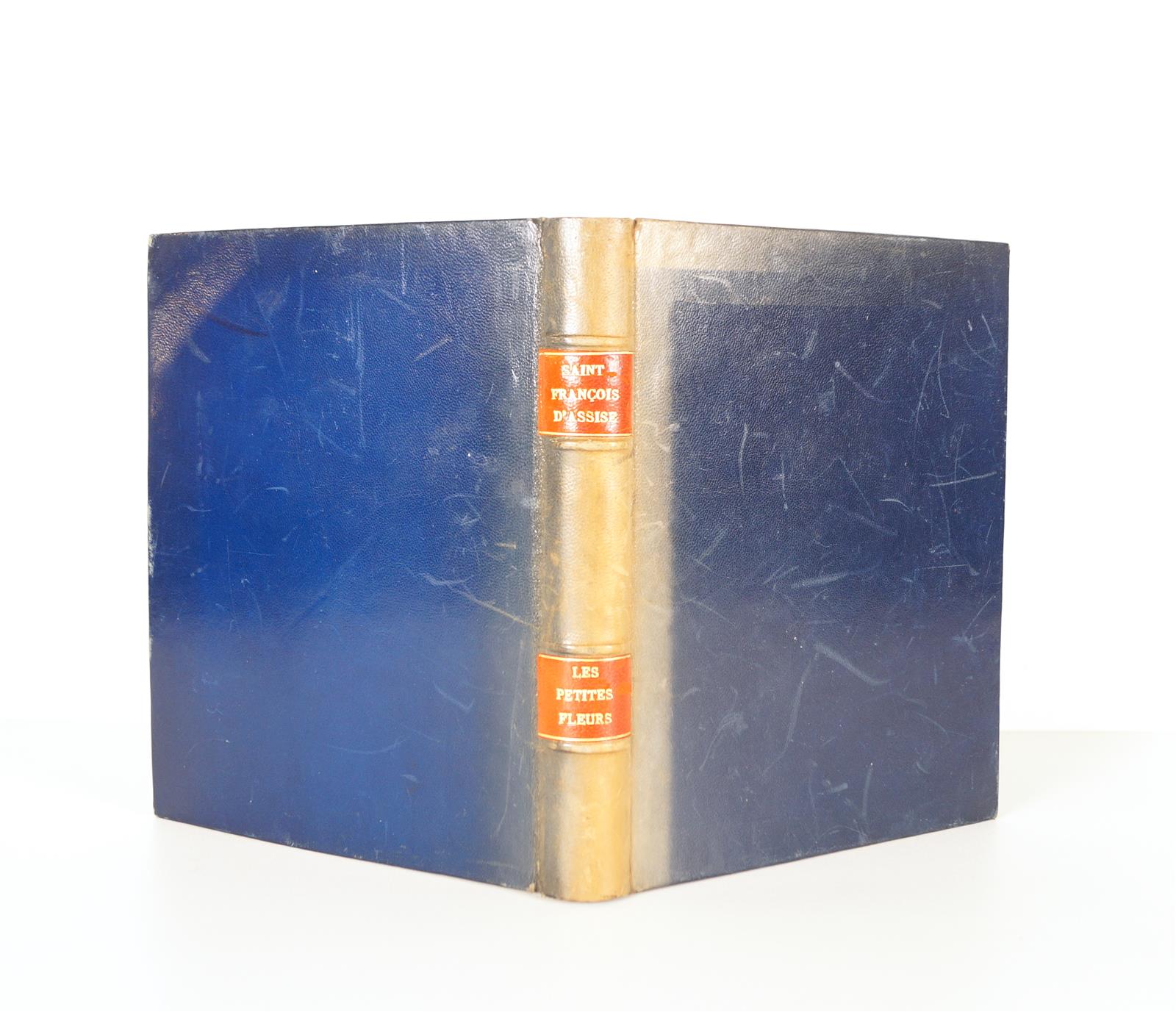 SAINT-FRANCOIS D'ASSISE - Les petites fleurs de Saint-François d'Assise choisies et traduites par Frédéric Ozanam - Paris ; Gibert Jeune, 1942 - 1 volume In-8° - 16 compositions hors texte et 68 dessins couleurs de Brunelleschi - Reliure de l'époque basane bleu nuit (1er plat partiellement insolé, plats légèrement griffés, coins frottés) - Couvertures et dos conservés - Dos à nerfs (passé uniformément) - Pièces de titre maroquin rouge - Bon exemplaire intérieur numéroté sur vélin.