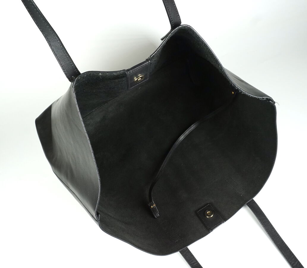 SAINT-LAURENT : Sac "cabas" porté épaule en cuir noir, lanière intérieure, fermeture à une pression, signé, L. 35-48 cm (légères usures d'usage, notamment aux anses).
