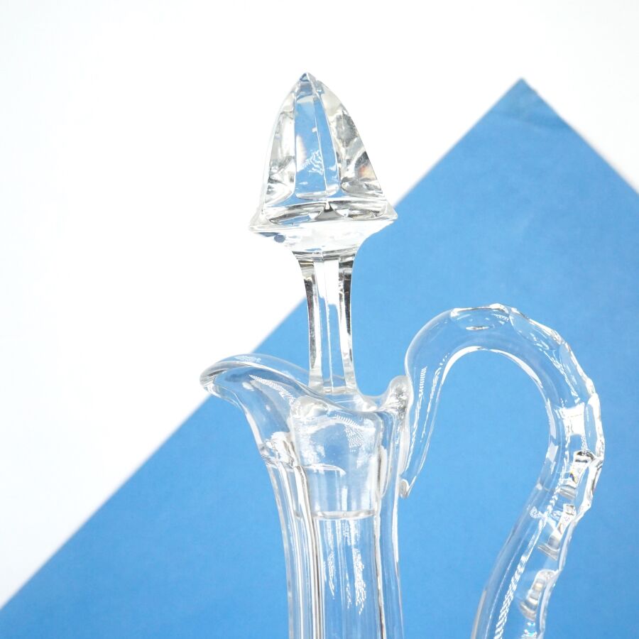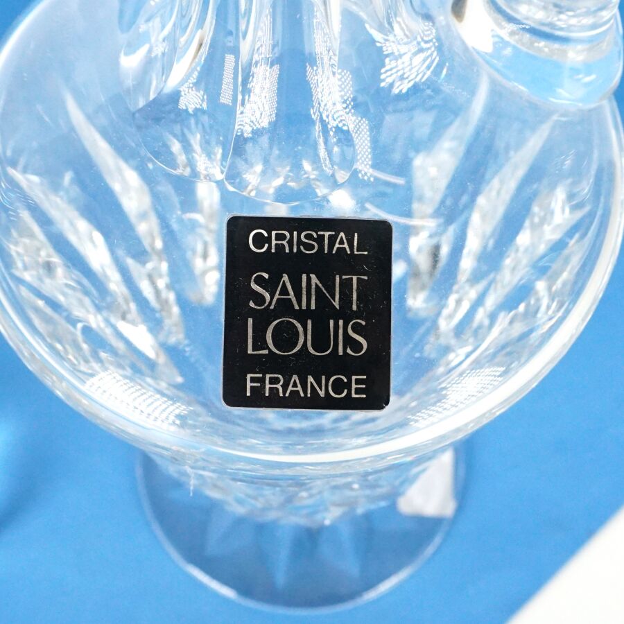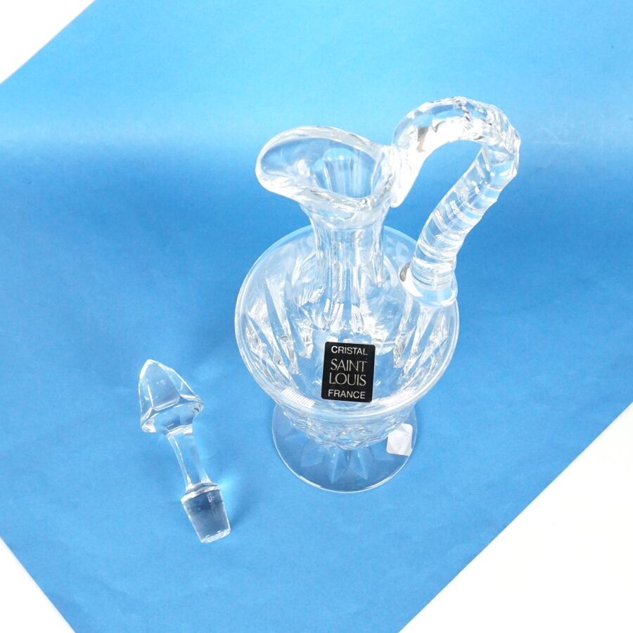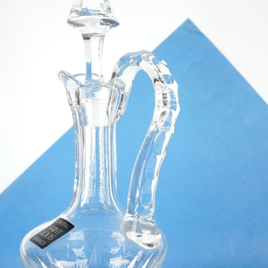 SAINT-LOUIS : Carafe sur piédouche en cristal taillé, une anse latérale, avec son bouchon, porte une étiquette sur la panse, H. 38 cm.