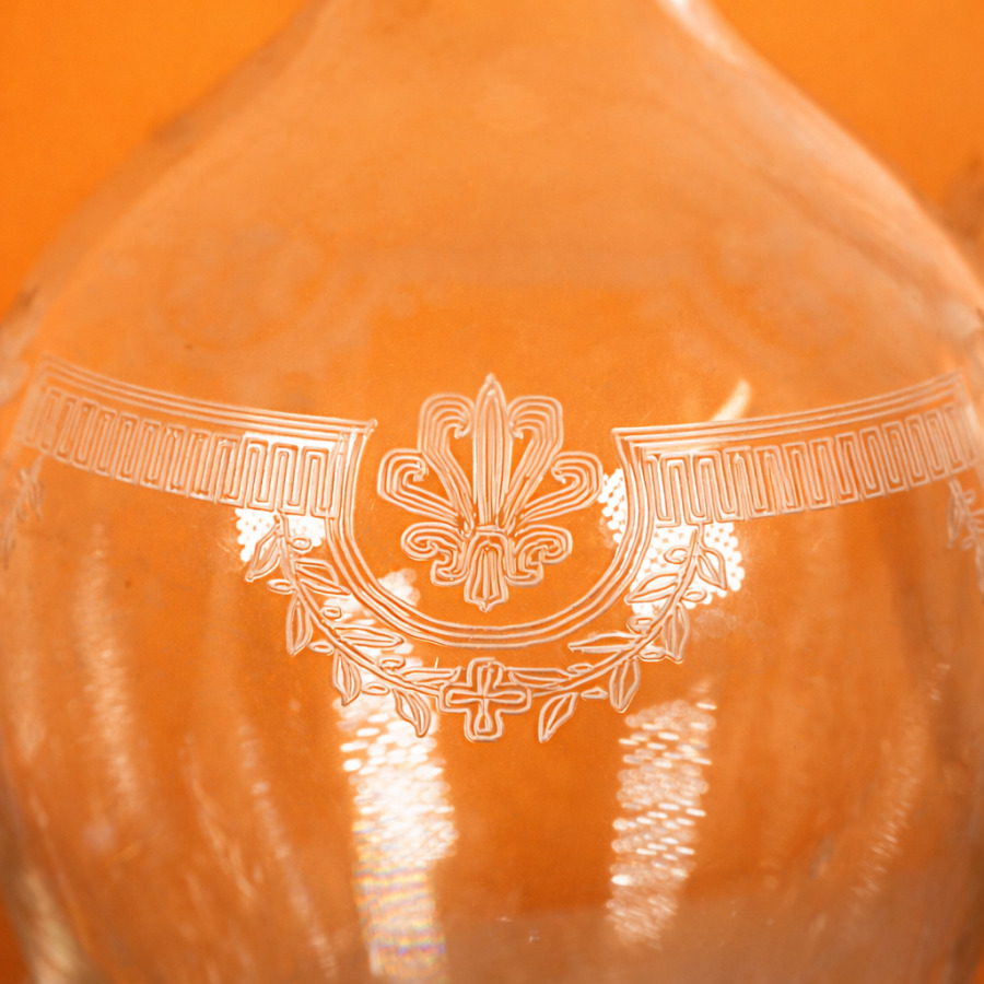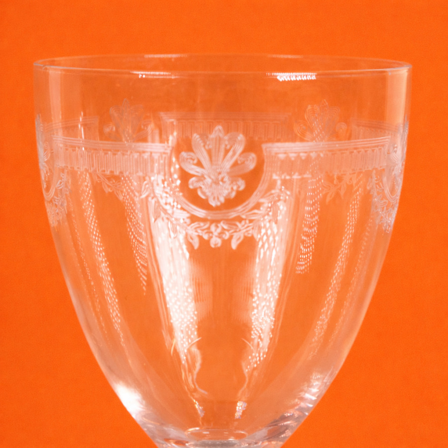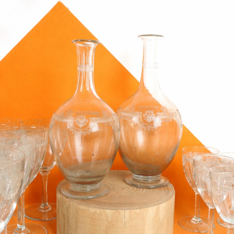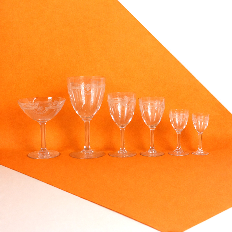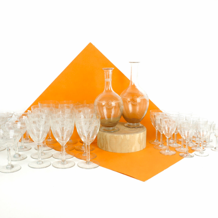 SAINT-LOUIS : Partie de service, modèle "Manon", en cristal à décor de palmettes et de guirlandes de feuillages comprenant 12 verres à eau, 14 coupes à champagne, 3 verres à vin rouge, 8 verres à vin blanc, 4 verres à porto, un verre à alcool et 2 carafes (sans bouchon), H. Verre à eau : 17 cm. H. Coupe à champagne : 12 cm (fêles et petits éclats).