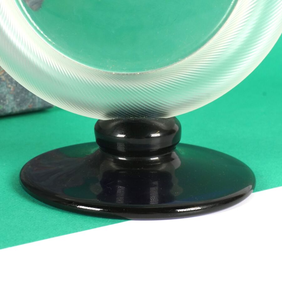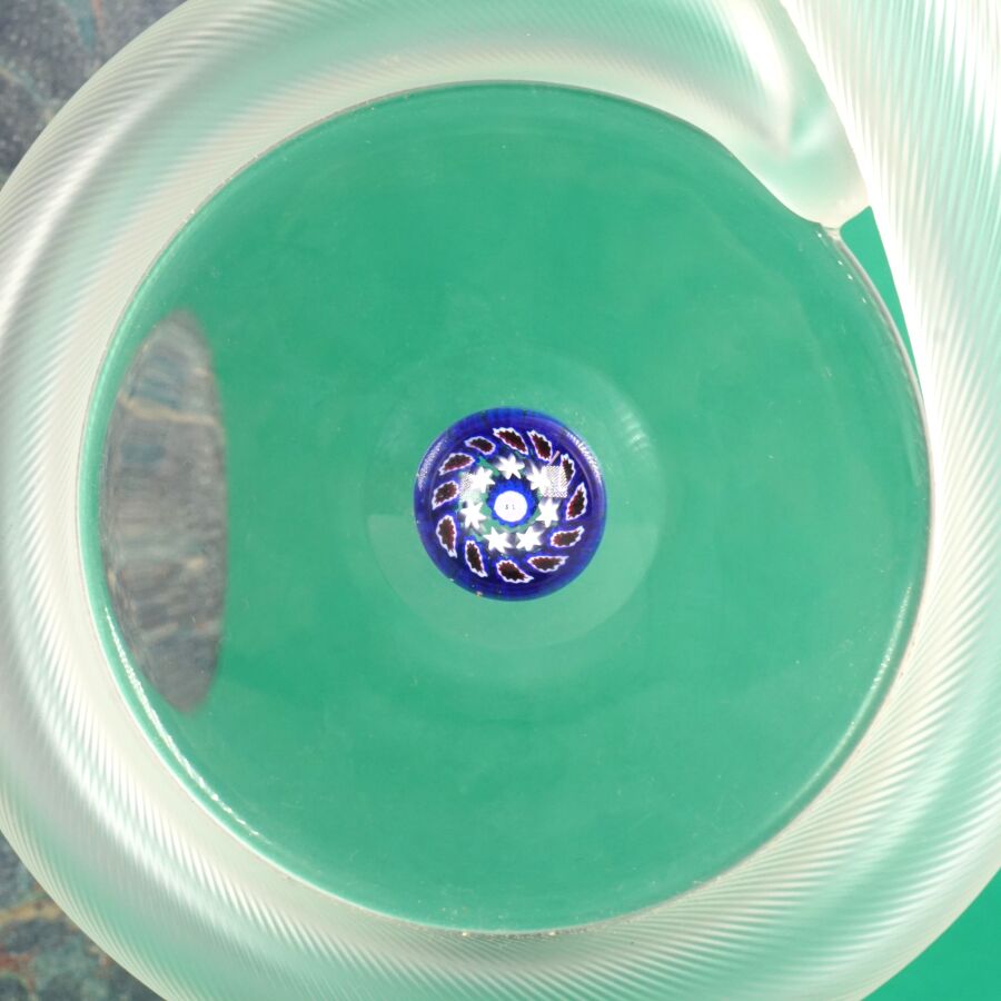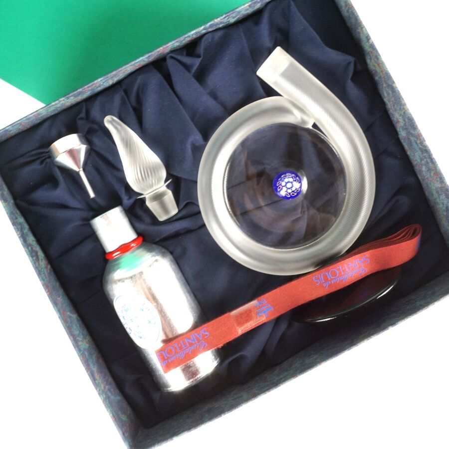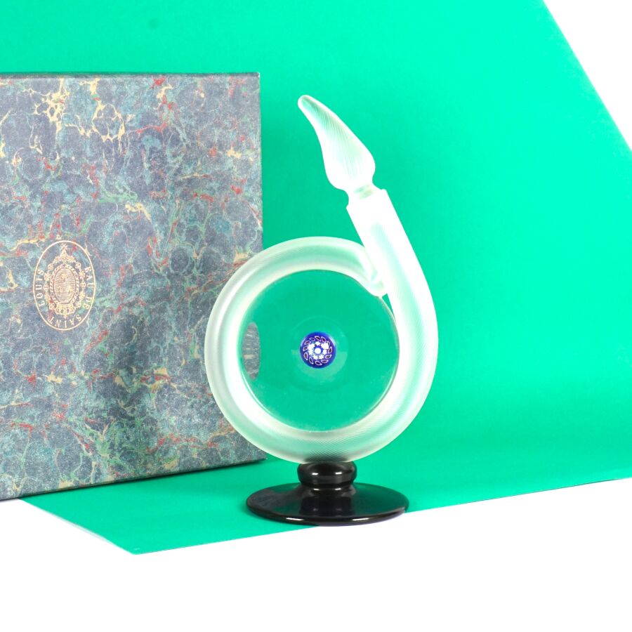 SAINT-LOUIS - Serge MANSAU (1930-2019) : "Eau de Saint-Louis" 1993, flacon de parfum de forme spirale en cristal incolore, le disque central agrémenté d'un sulfure millefiore, l'extrémité rainuré se terminant par un bouchon piriforme rainuré, présenté sur un piédouche teinté bleu, marqué au tampon doré dessous, présenté dans sa boîte d'origine avec flacon recharge, entonnoir et notice, H. Flacon : 21.5 cm.