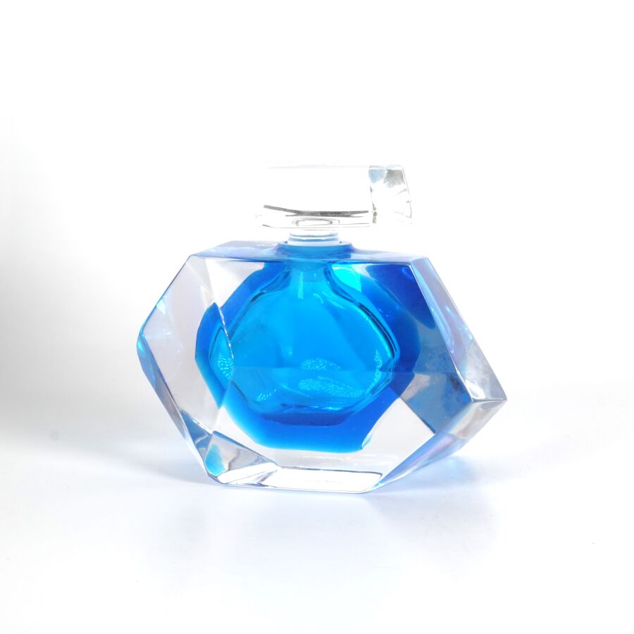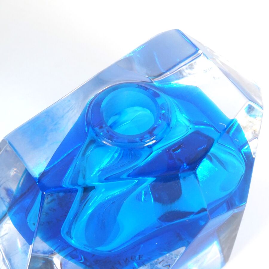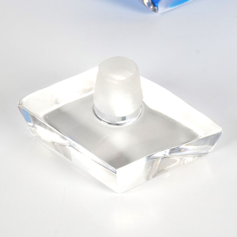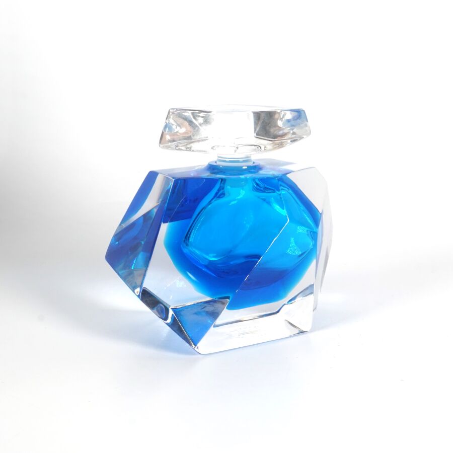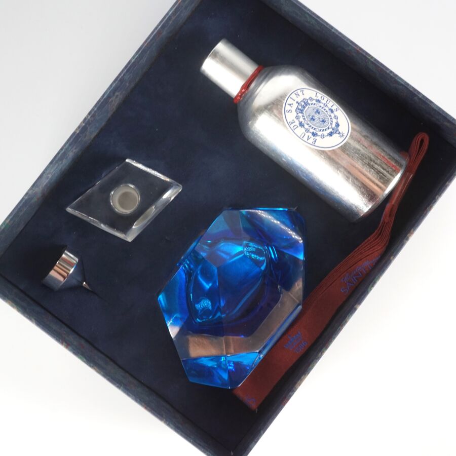 SAINT-LOUIS - Serge MANSAU (1930-2019) : Flacon à parfum "Eau de Saint Louis" 1994 en cristal taillé à pans partiellement teinté bleu, avec son bouchon à pans coupés, présenté dans son coffret avec sa recharge et son entonnoir, H. 9 cm.