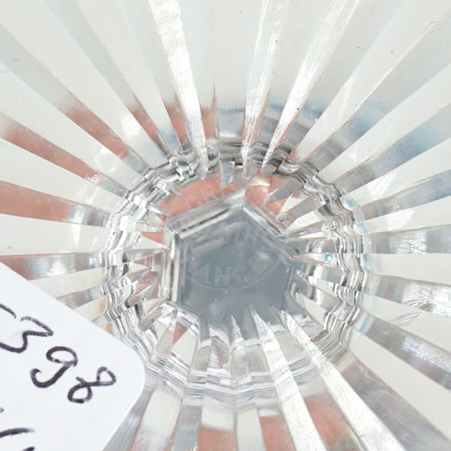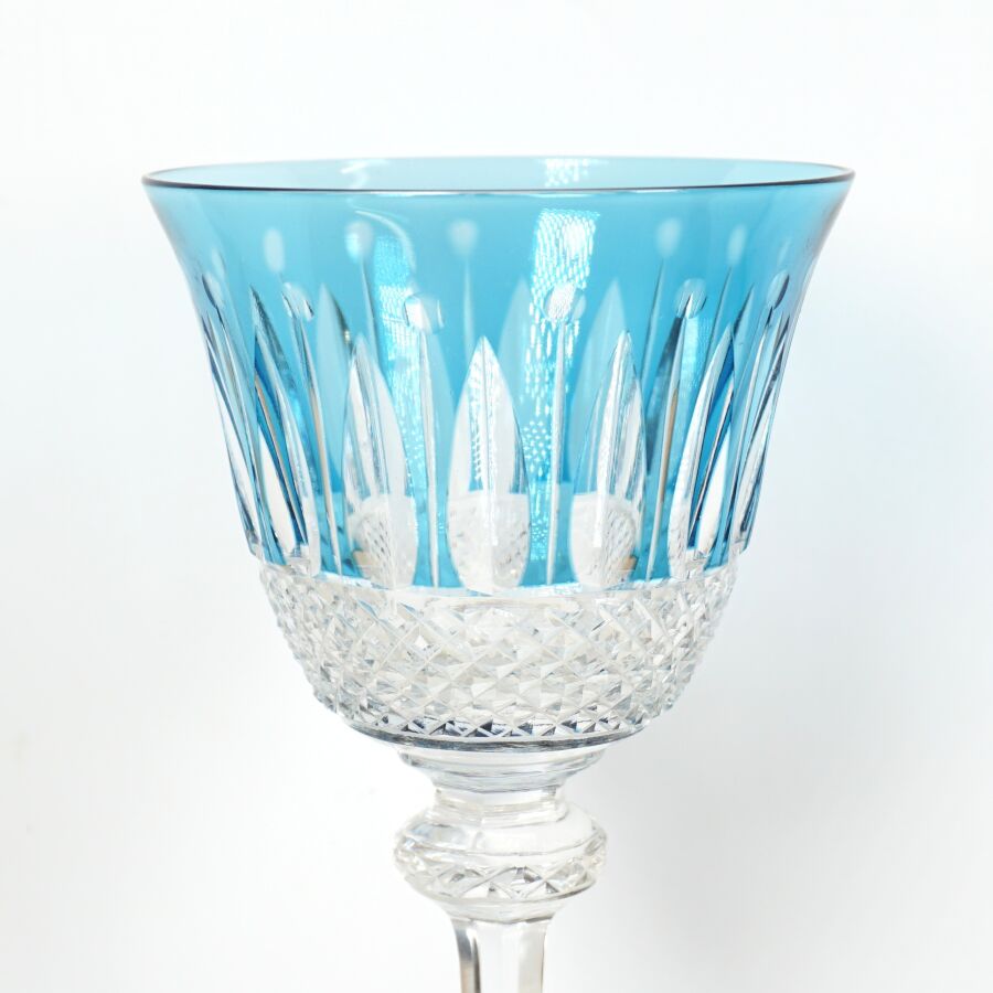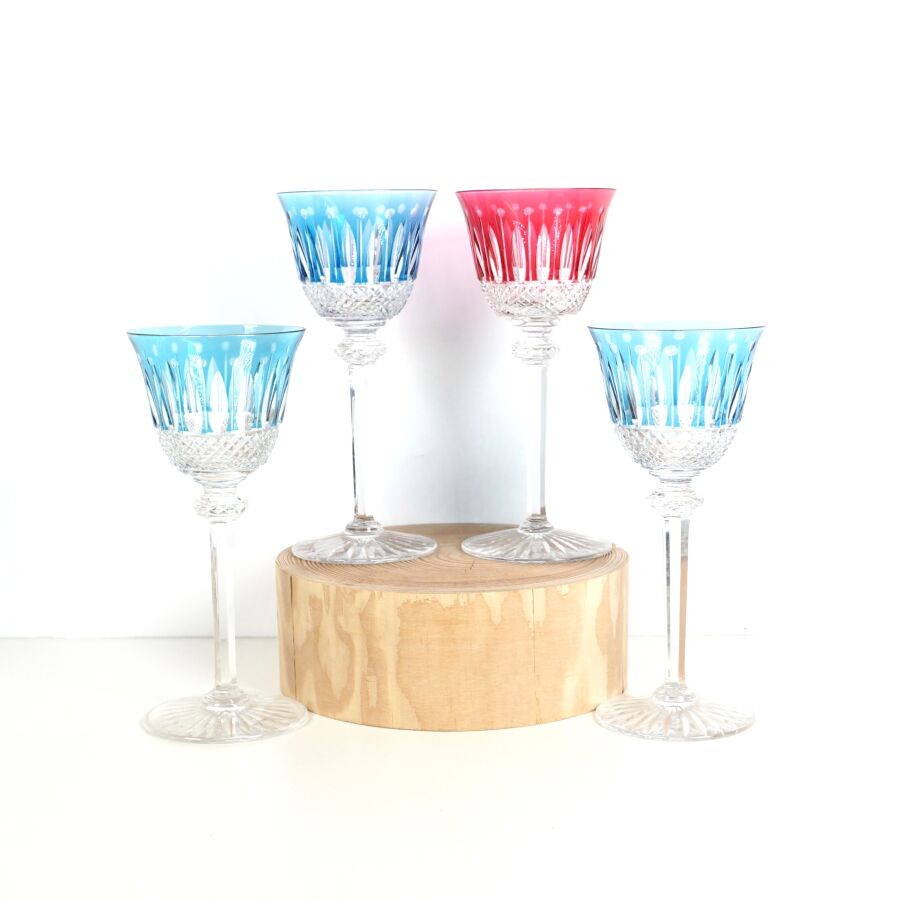 SAINT LOUIS : Suite de quatre verres, modèle "Tommy", en cristal taillé incolore et partiellement coloré, marqués au tampon dessous, H. 13 cm.